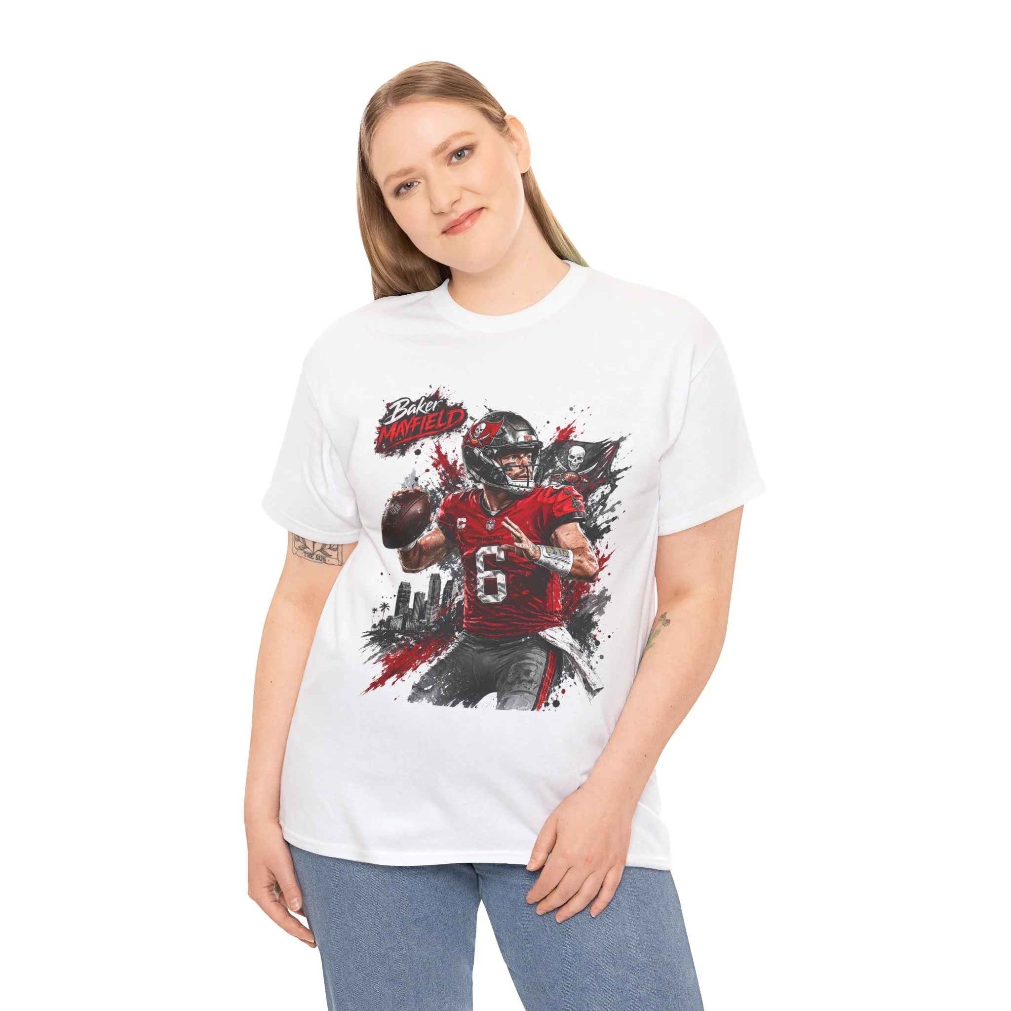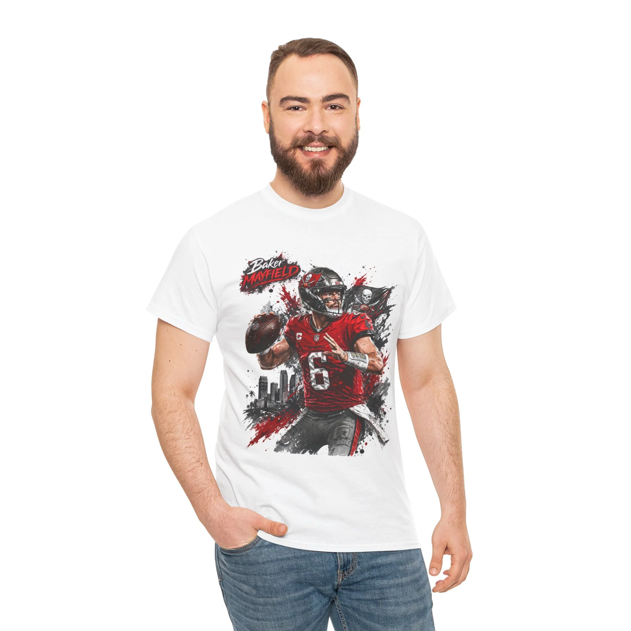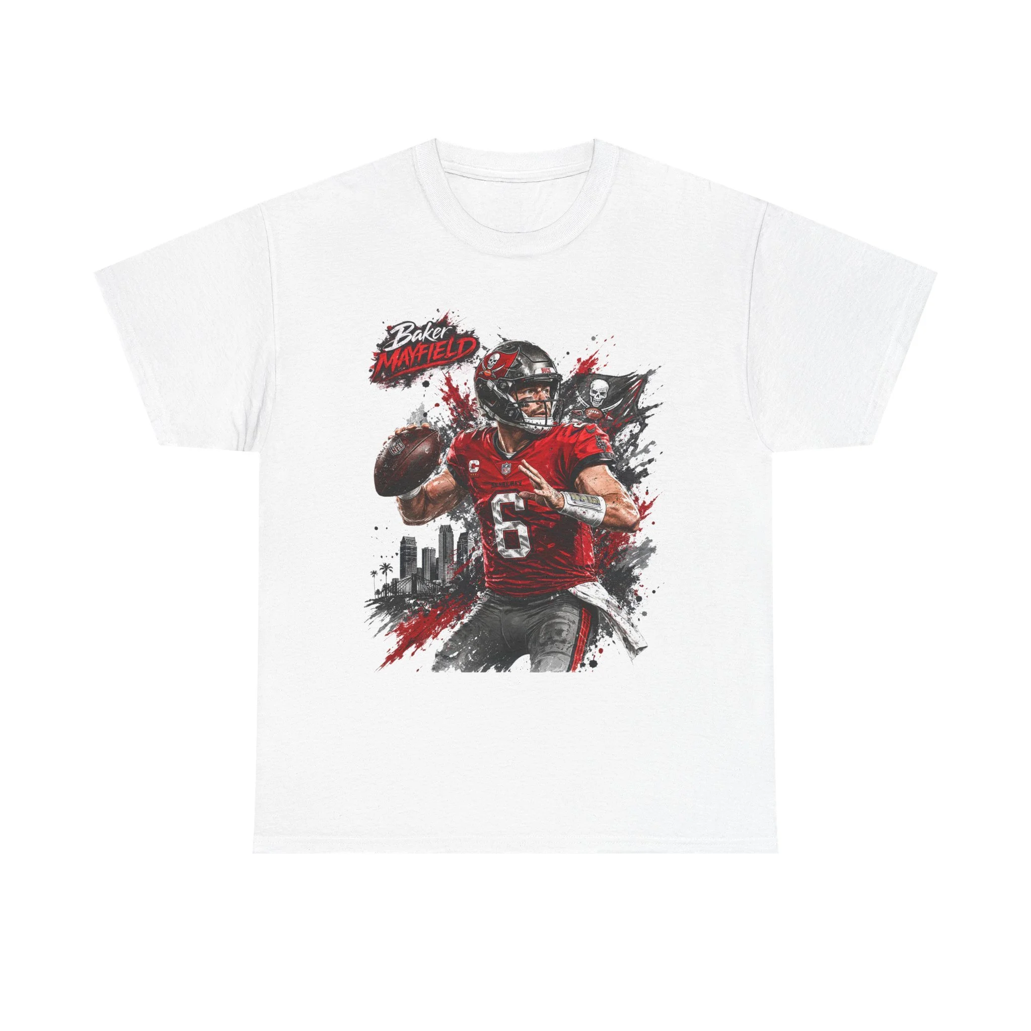 This classic cotton tee puts game-day energy on full display. The front features a bold, dynamic quarterback graphic rendered in painterly strokes of red, black, and gray — motion lines, splatters, and a city skyline give the artwork a gritty, stadium-night vibe. The shirt’s relaxed crew-neck silhouette and medium-weight 100% cotton knit make it easy to wear from tailgate to couch. It feels lived-in from the first wear, but keeps its shape thanks to ribbed collar and shoulder tape. The soft, tear-away label keeps things itch-free, while durable printing methods preserve detail across washes. Wear it when you want to rep that competitive spirit without shouting.