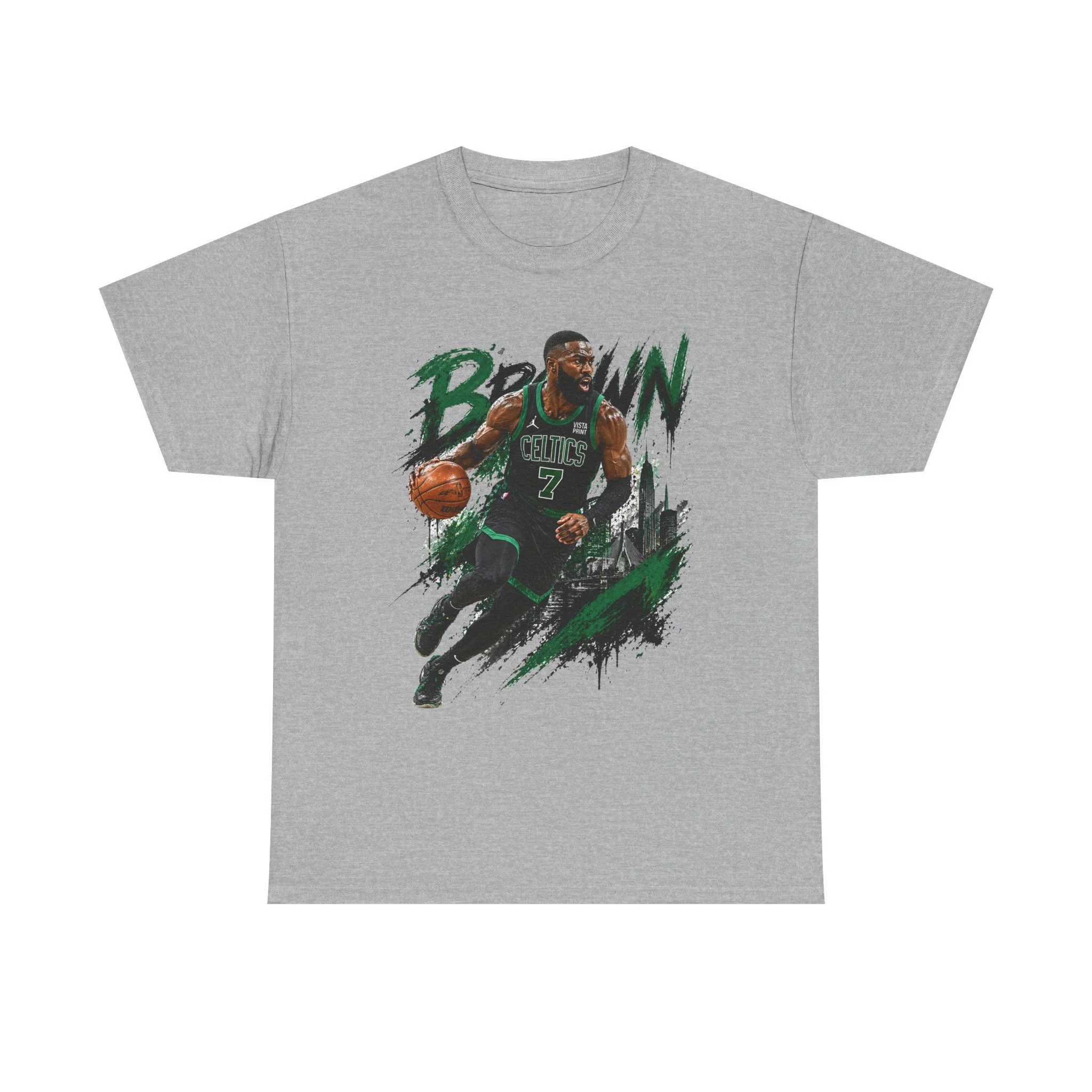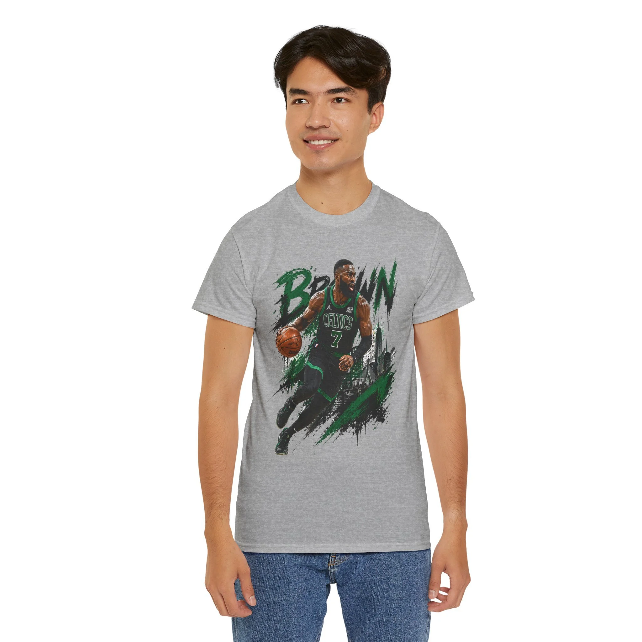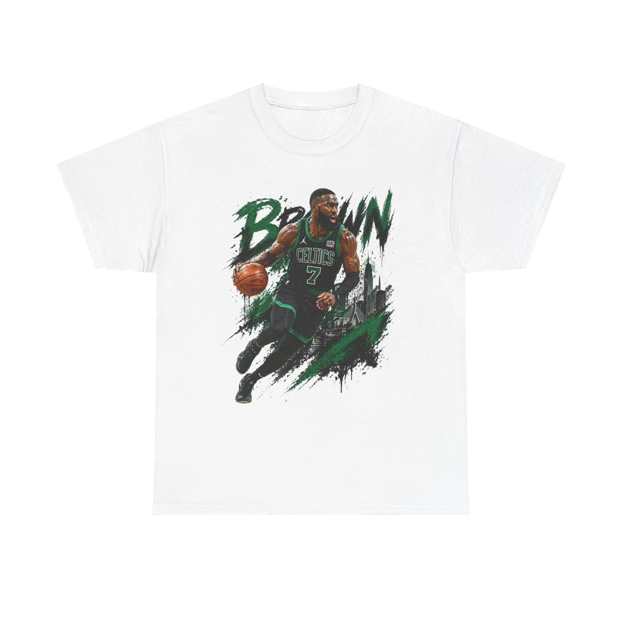 This tee brings game-day energy into everyday wear. A sturdy, smooth cotton canvas carries a dynamic basketball illustration — a player in motion with bold green accents and brushstroke textures — that reads like a snapshot of a fast break. The shirt feels lived-in but durable: medium-weight fabric holds the print crisply while the classic crew neck and relaxed cut make it easy to layer or wear solo. Wear it to the court, to a watch party, or while running errands; it moves with you and keeps the focus on the play.