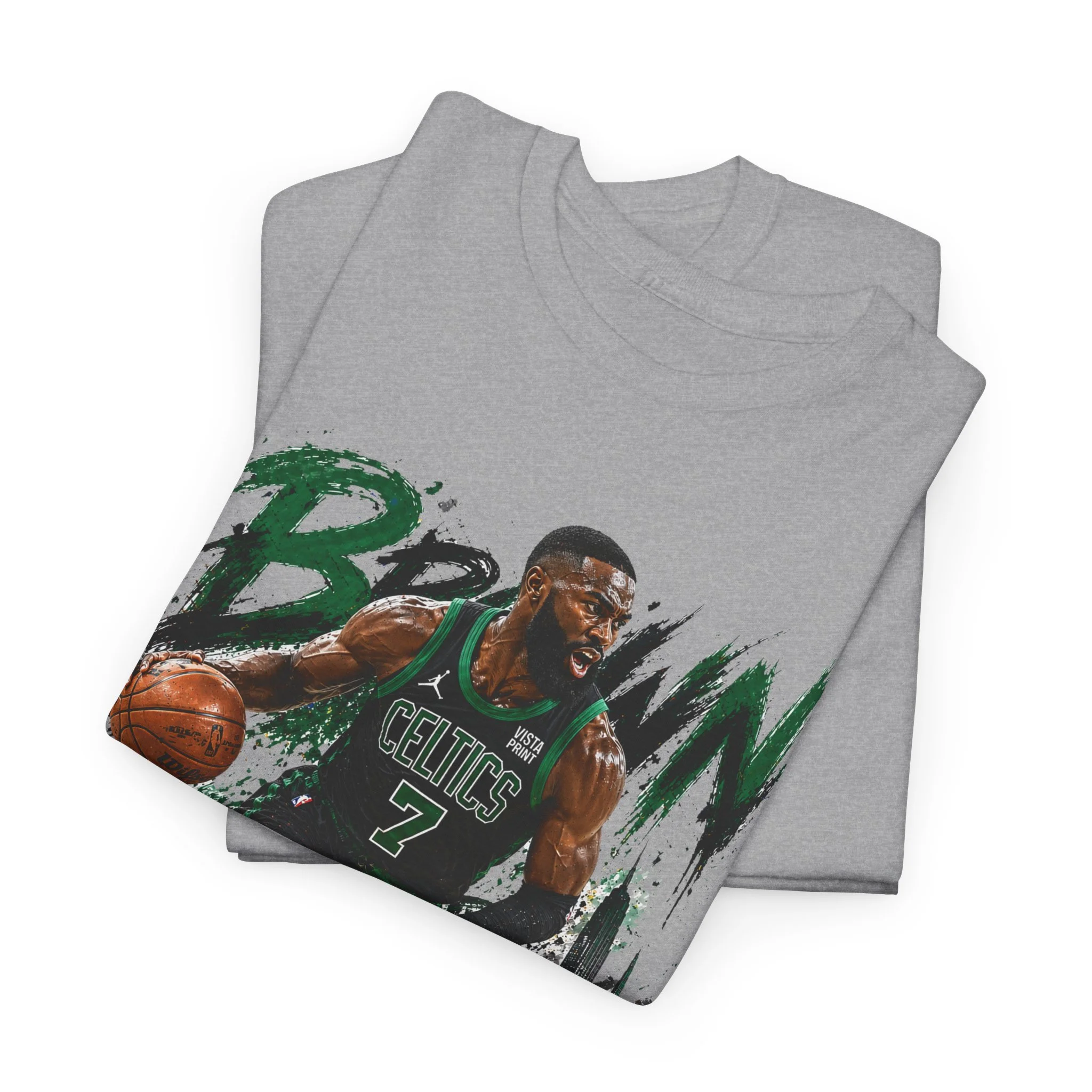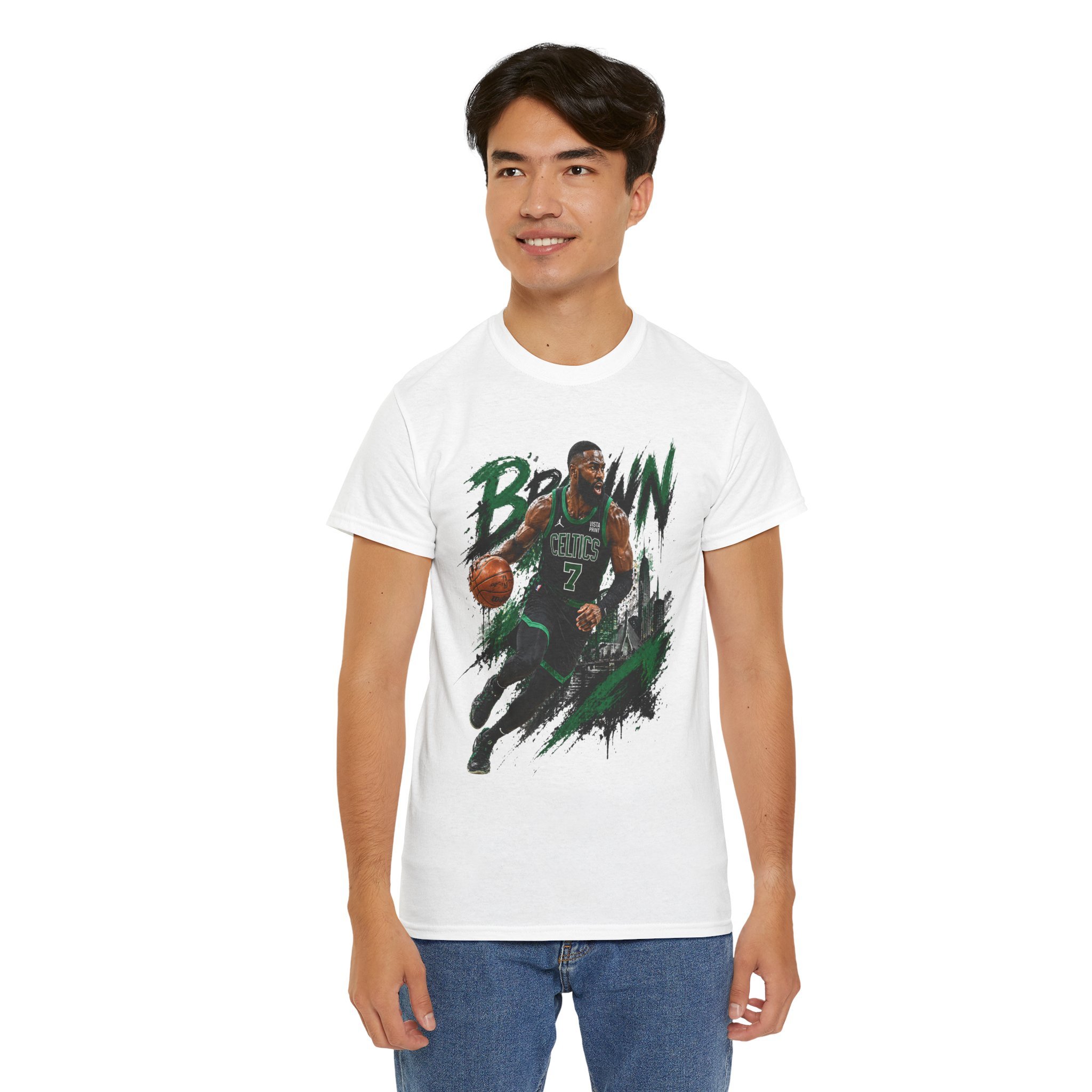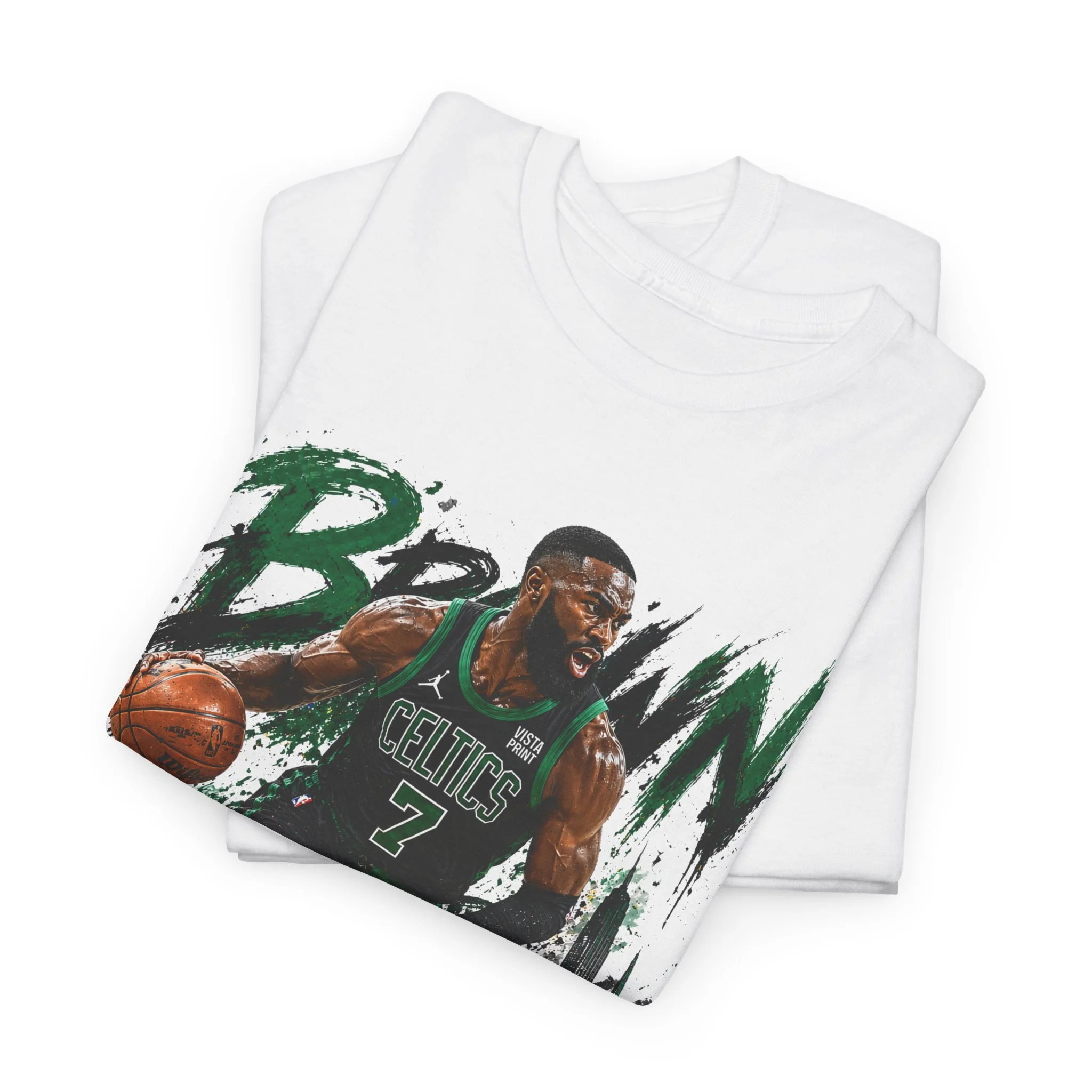 This tee brings game-day energy into everyday wear. A sturdy, smooth cotton canvas carries a dynamic basketball illustration — a player in motion with bold green accents and brushstroke textures — that reads like a snapshot of a fast break. The shirt feels lived-in but durable: medium-weight fabric holds the print crisply while the classic crew neck and relaxed cut make it easy to layer or wear solo. Wear it to the court, to a watch party, or while running errands; it moves with you and keeps the focus on the play.