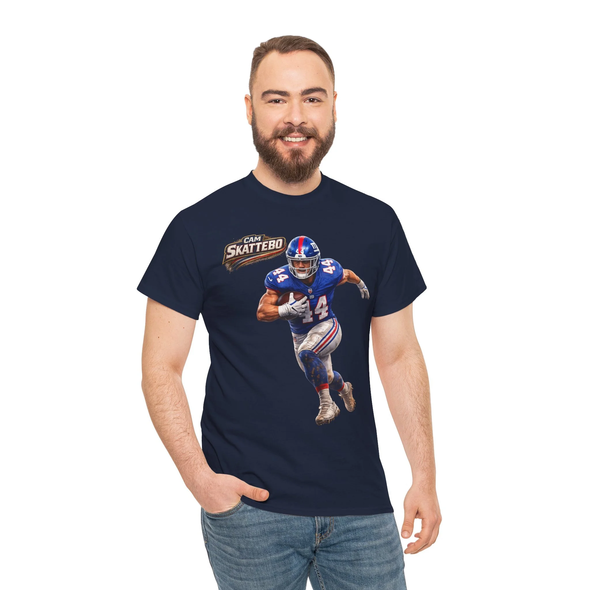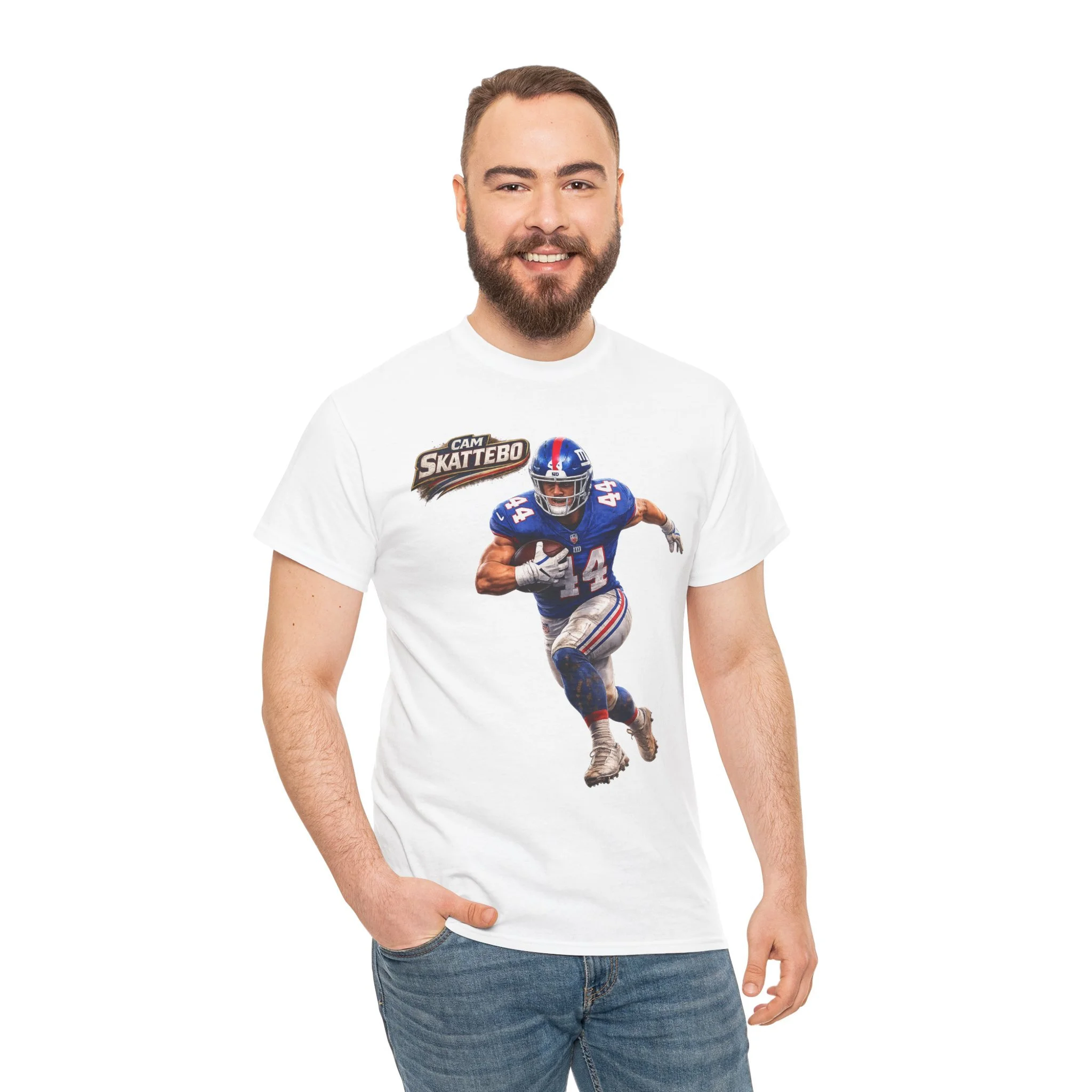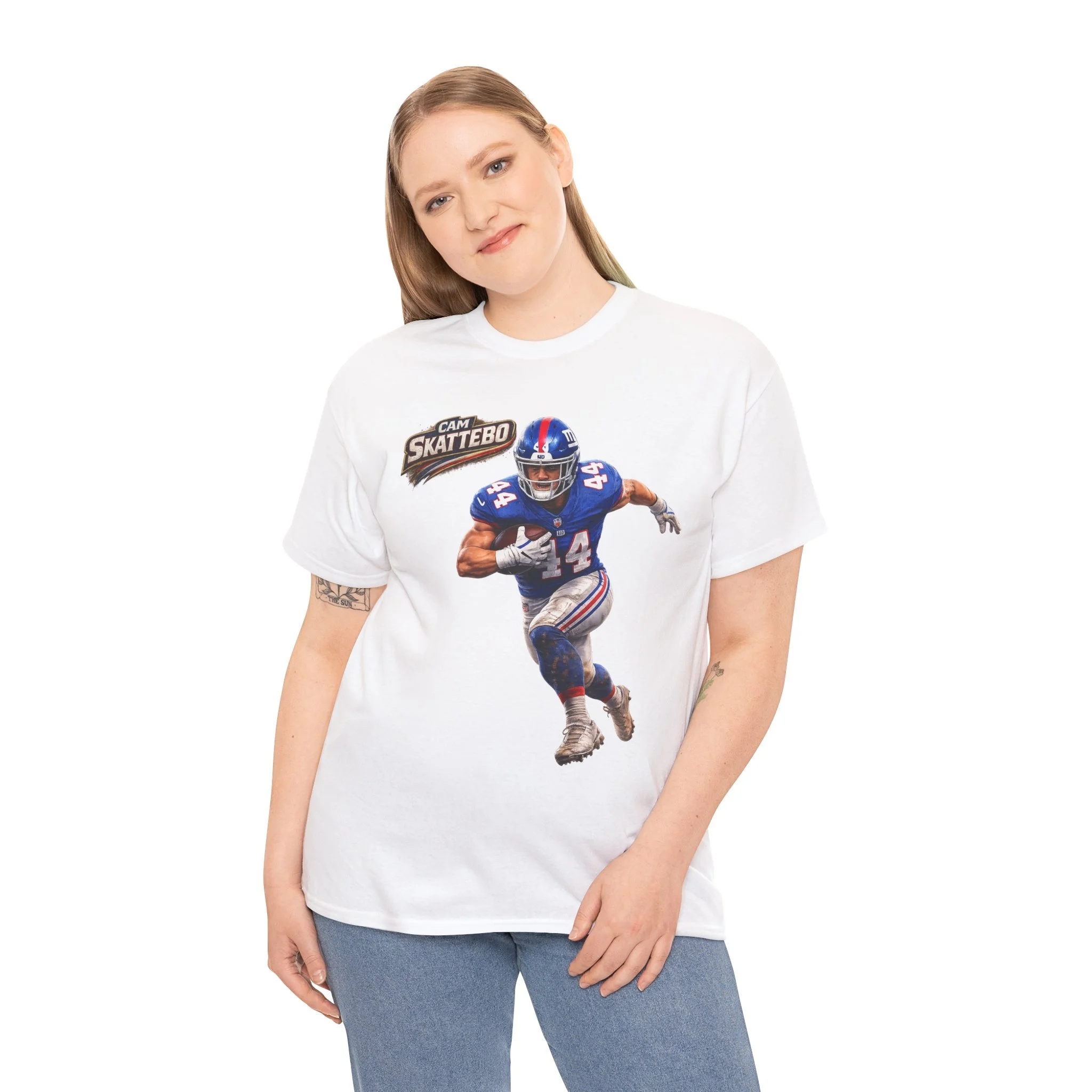 This white cotton tee celebrates hometown football pride with bold, game-day energy. A vivid front print shows a dynamic quarterback in motion, framed by action bursts and team-style lettering that reads “Cam Skattebo.” The colors pop against the clean white background, making the artwork the focal point whether you’re headed to a tailgate, watching the game at a friend’s house, or layering it under a jacket for casual outings. The shirt’s relaxed crew-neck cut and medium-weight fabric give it a lived-in comfort that holds up after many wears and washes. It feels like the kind of tee you pull on when you want to show support and relive those big-play moments.