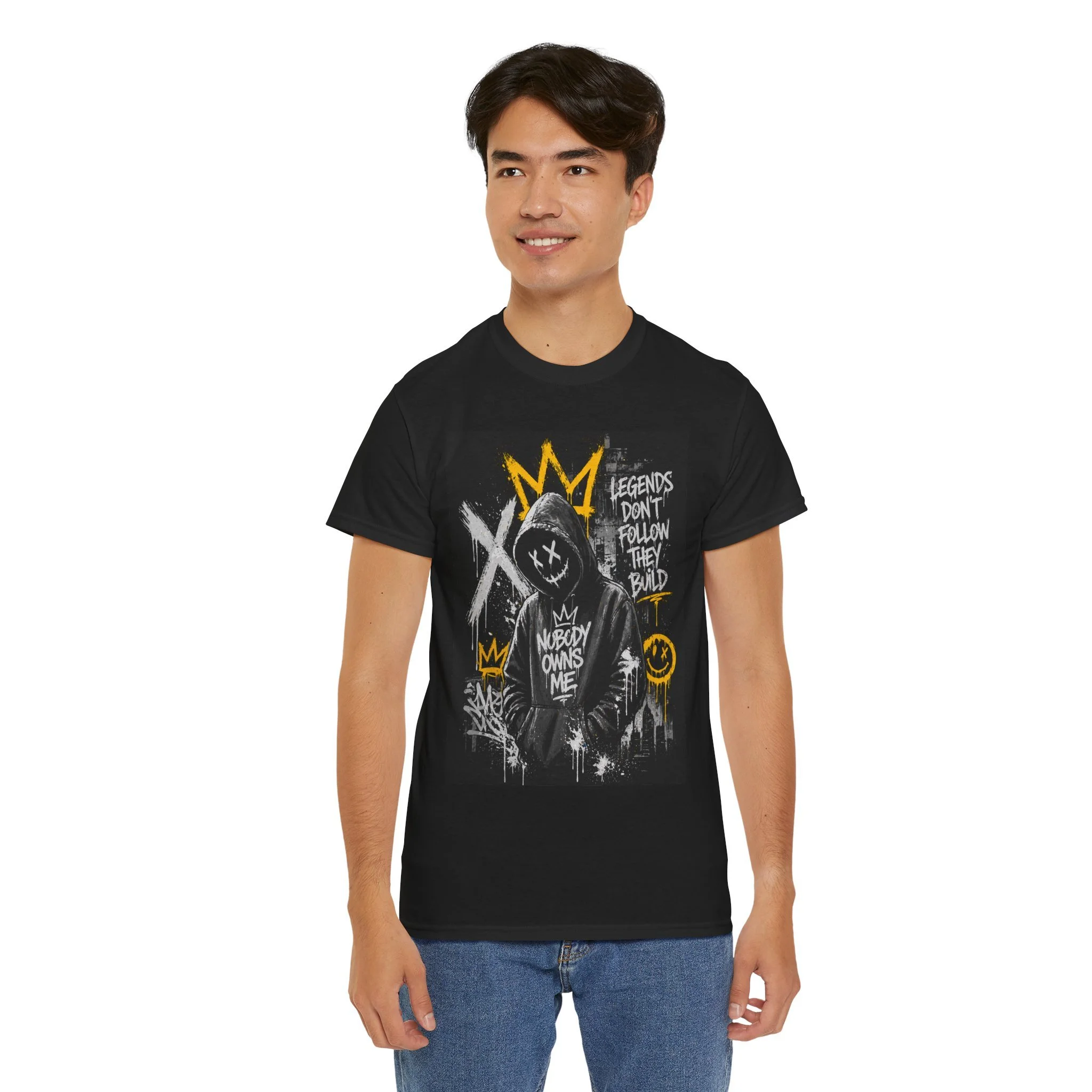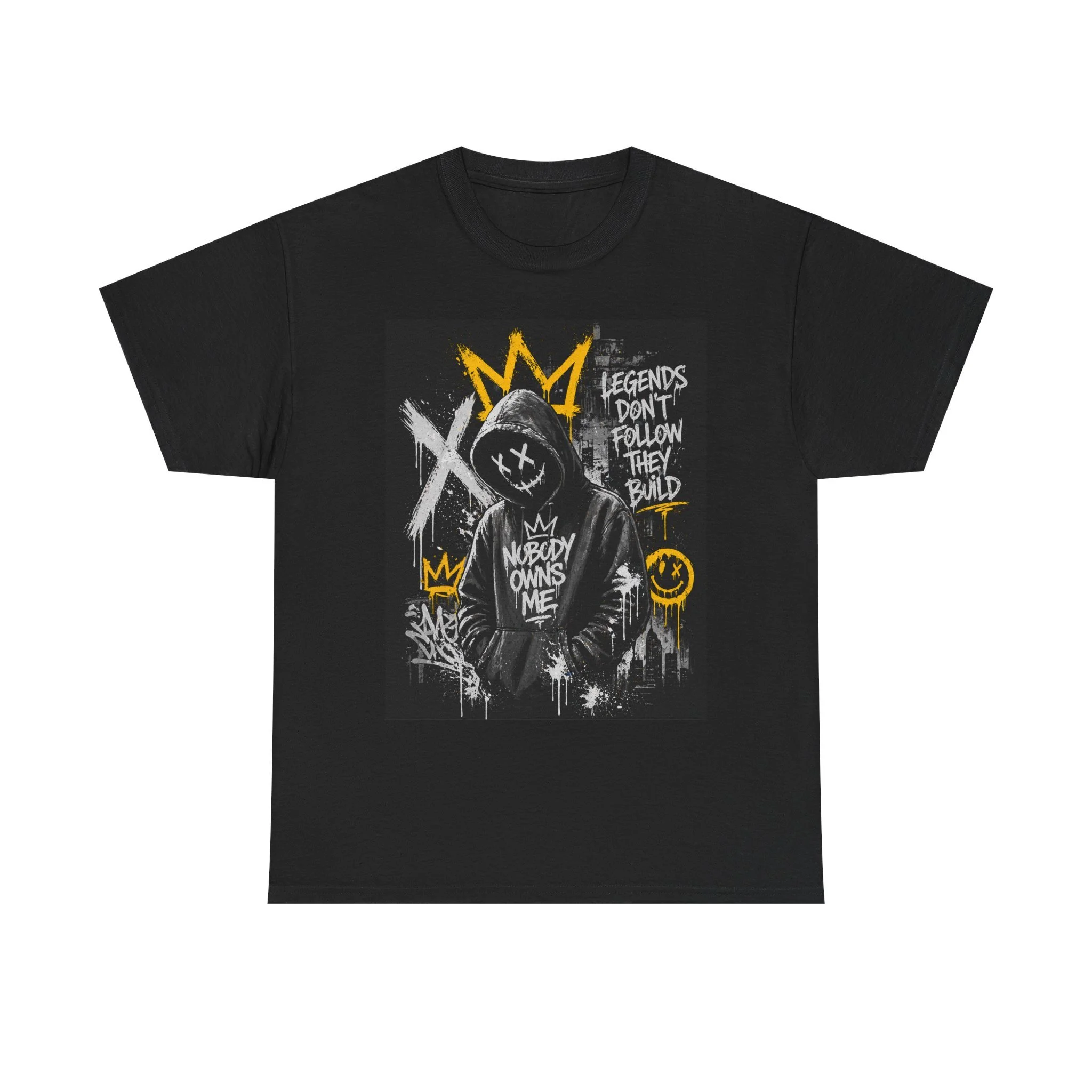 A bold, streetwise black tee that wears like attitude. The oversized silhouette carries a raw graffiti-style print: a hooded figure with a gold crown, crossed-out eyes, and scrawled phrases like “LEGENDS DON’T FOLLOW THEY BUILD” and “NOBODY OWNS ME.” The artwork mixes stencil drips, spray marks, and hand-drawn smiley motifs for an urban, DIY energy. It sits comfortably as a wardrobe staple—layer it under a bomber, wear it with ripped denim, or let it hang loose while skateboarding or hanging at a late-night show. This shirt speaks to people who build their own rules and prefer statements over slogans.