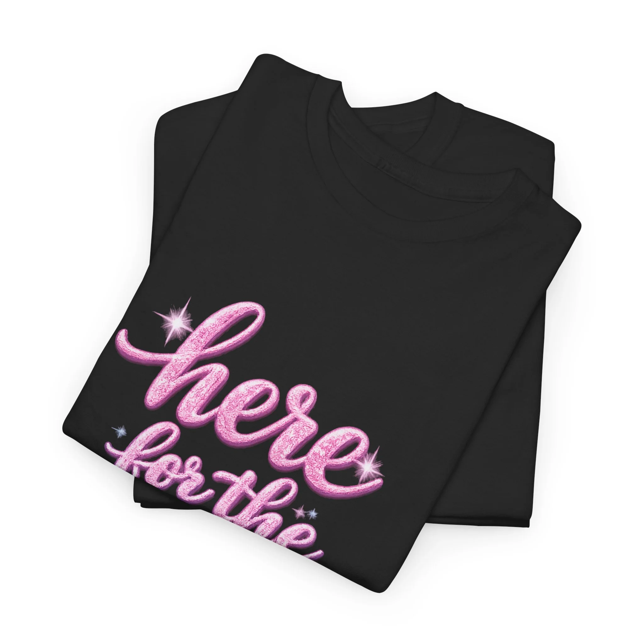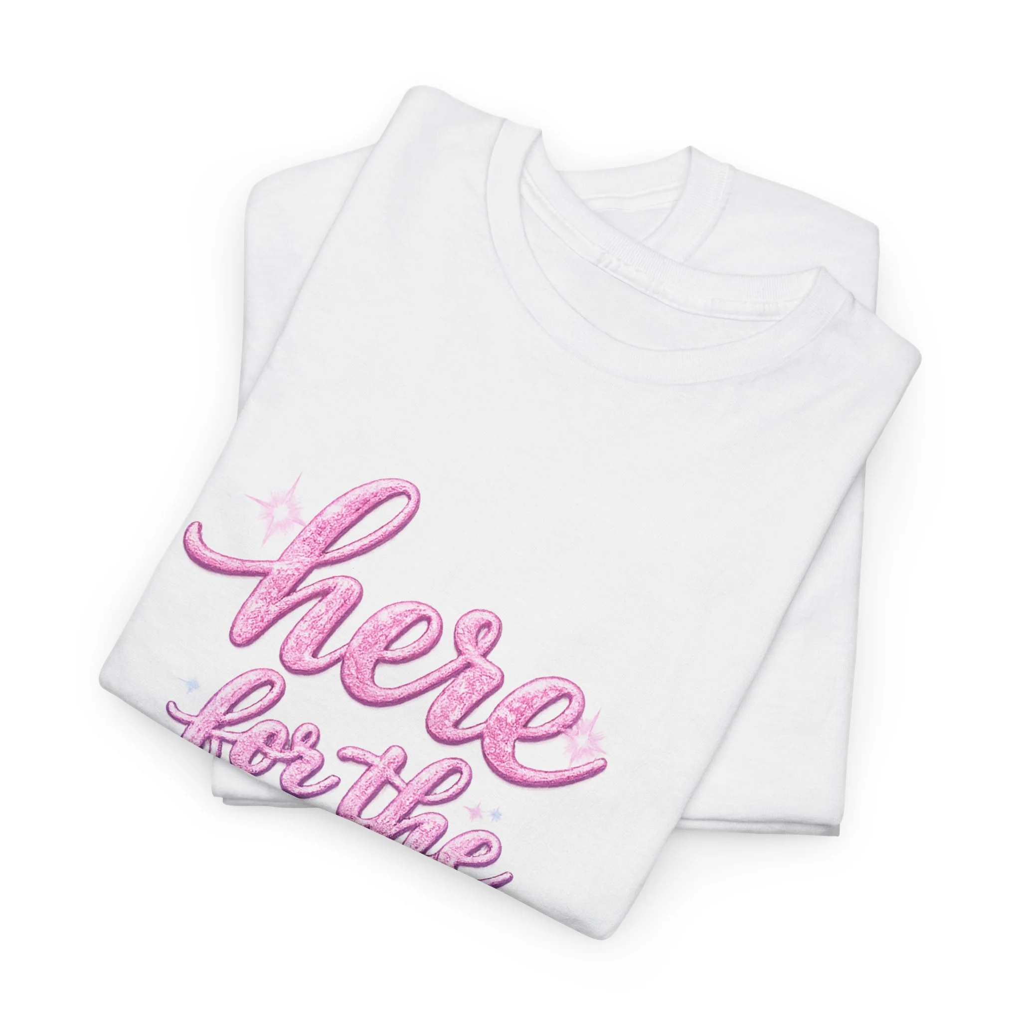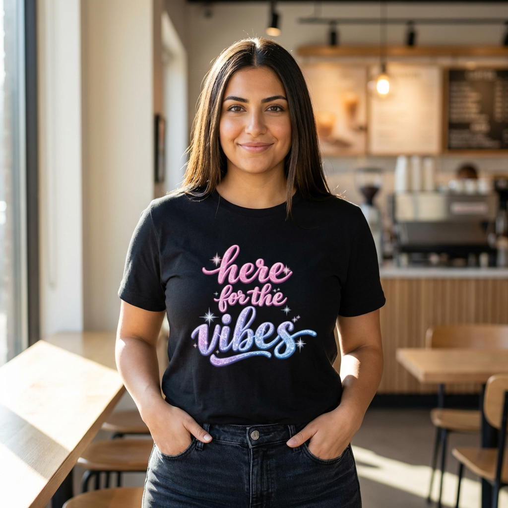 A lighthearted, casual tee that reads like a friendly reminder to slow down and soak in the moment. Soft pastel lettering—blended pinks and lavenders with a subtle shimmer—spells out “here for the vibes” across the chest. The silhouette is relaxed and roomy, so it layers easily over a tank or tucks into high-waist denim. Wear it to coffee runs, backyard hangouts, or low-key festivals when you want to project easygoing energy without putting on a show. The print’s watercolor-like texture feels handmade and personal, matching the tee’s breathable, everyday comfort.