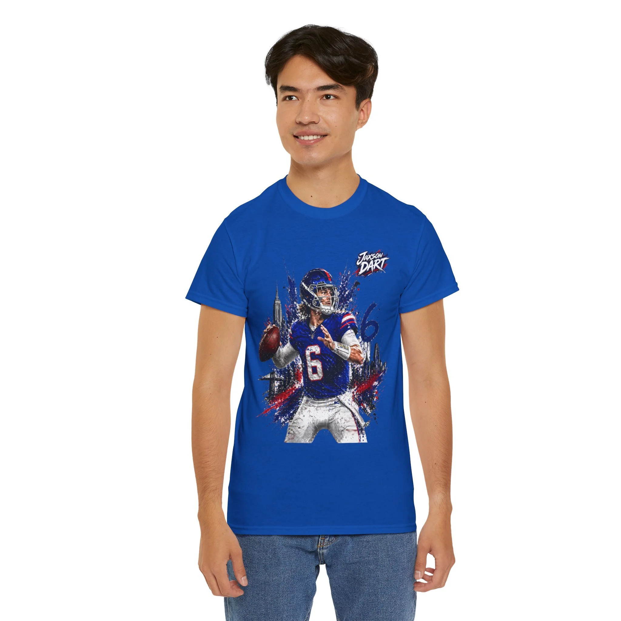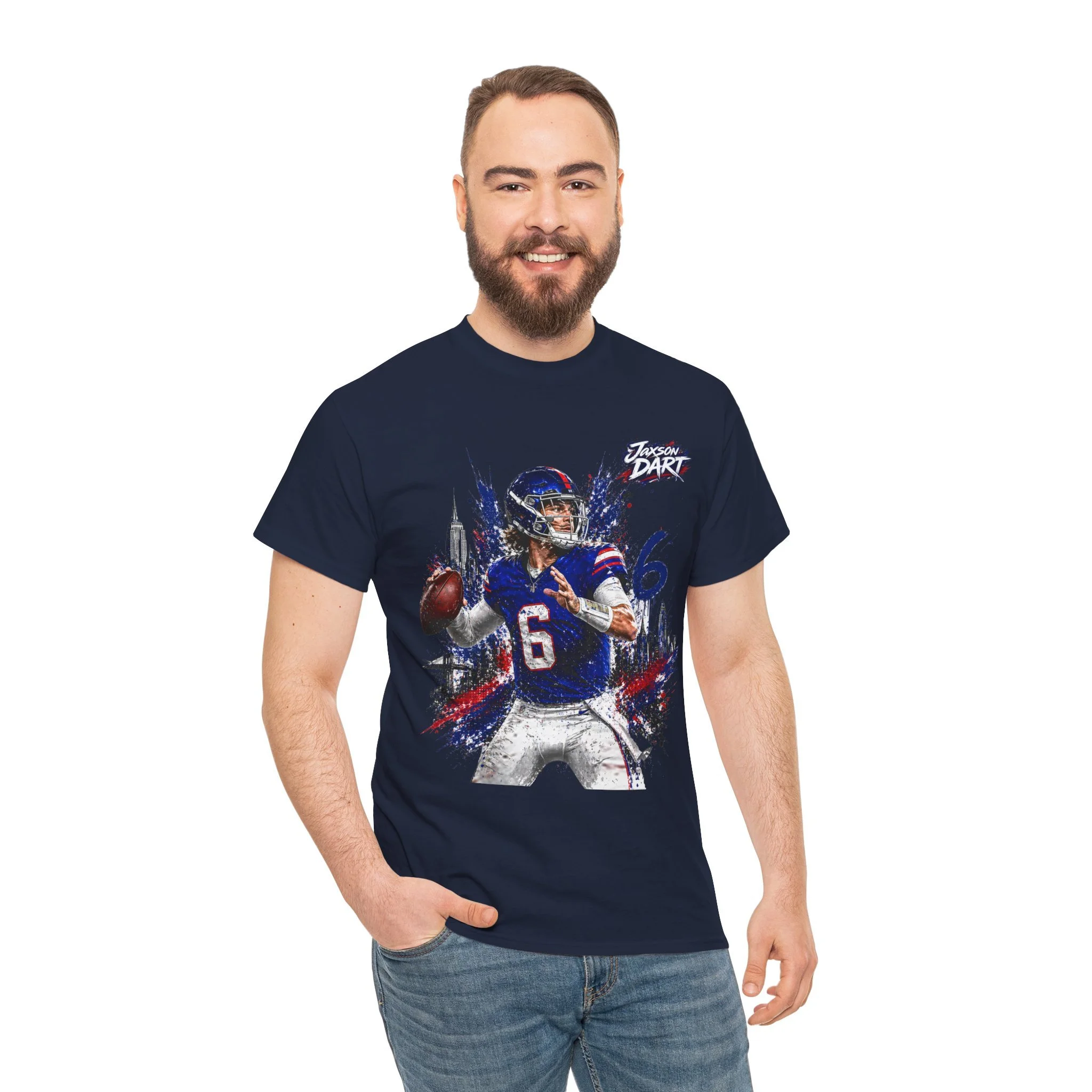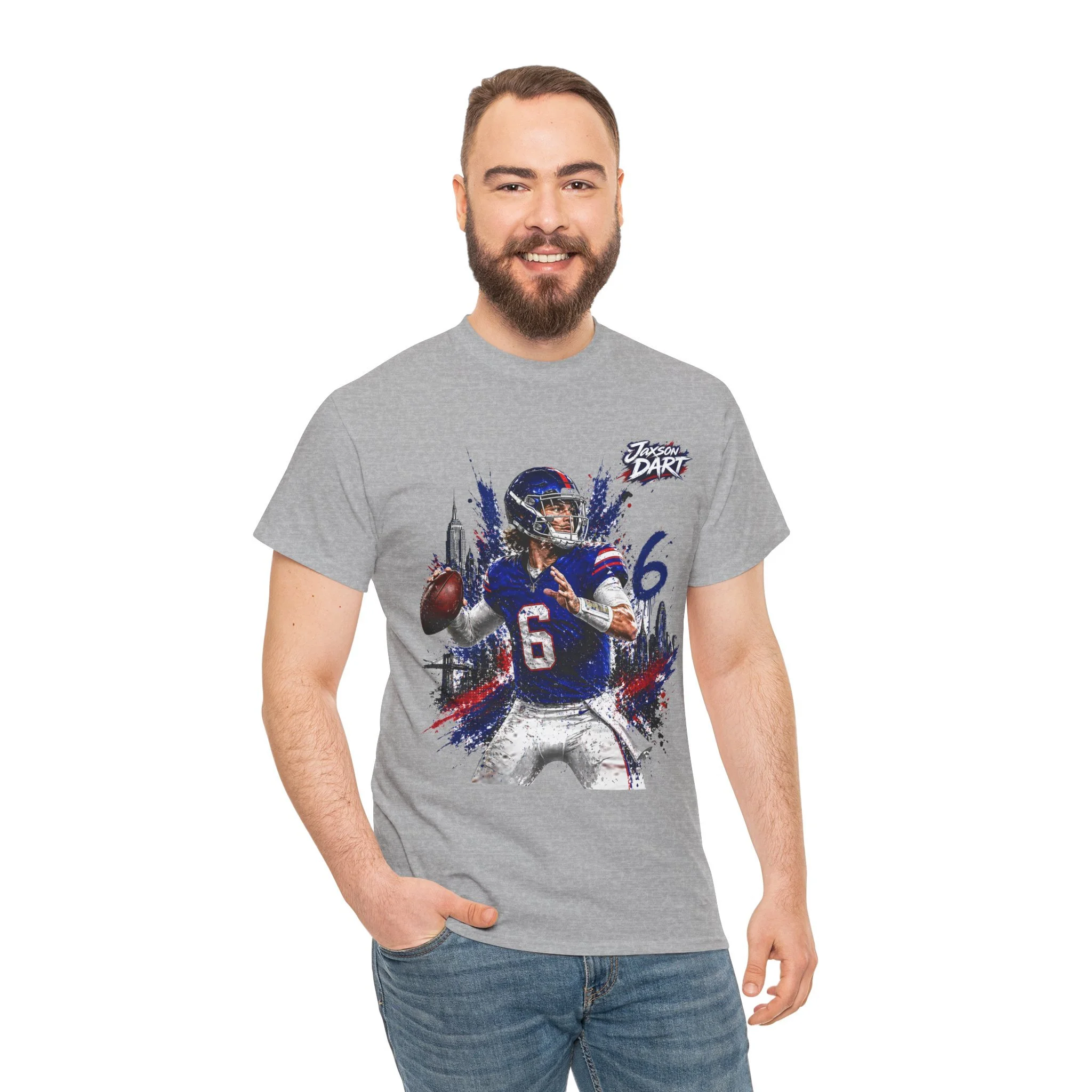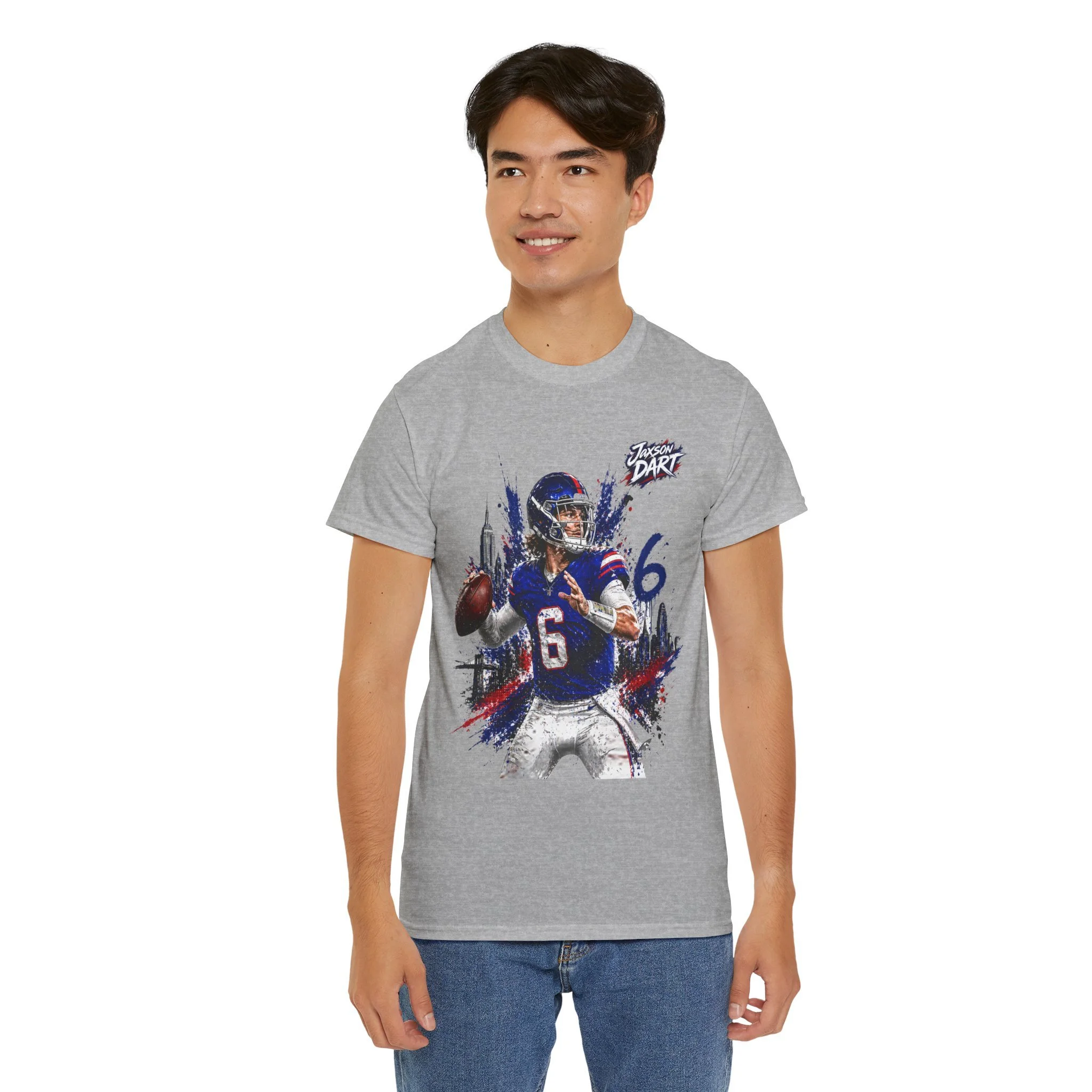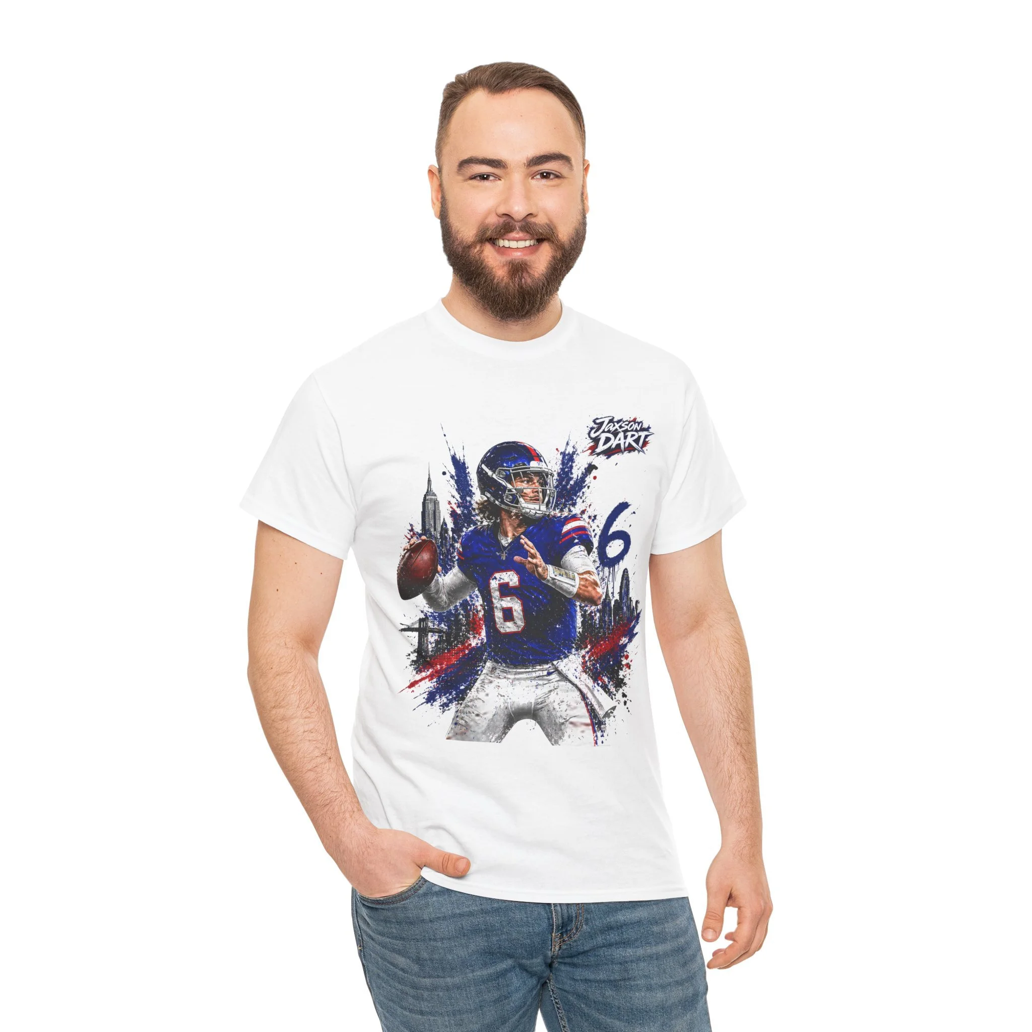 This classic cotton tee brings game-day energy into everyday wear. The bold, dynamic graphic of a quarterback in mid-throw uses vivid DTF and DTG printing for sharp detail and saturated color that stands out on the chest. Built on a roomy, classic-fit silhouette with a ribbed collar and tear-away label, the shirt feels familiar and comfortable from the first wear. Durable, ethically sourced cotton and reinforced shoulder tape mean this tee holds its shape through washes and seasons — great for cheering from the stands, hanging with your crew, or layering under a jacket on cooler evenings.