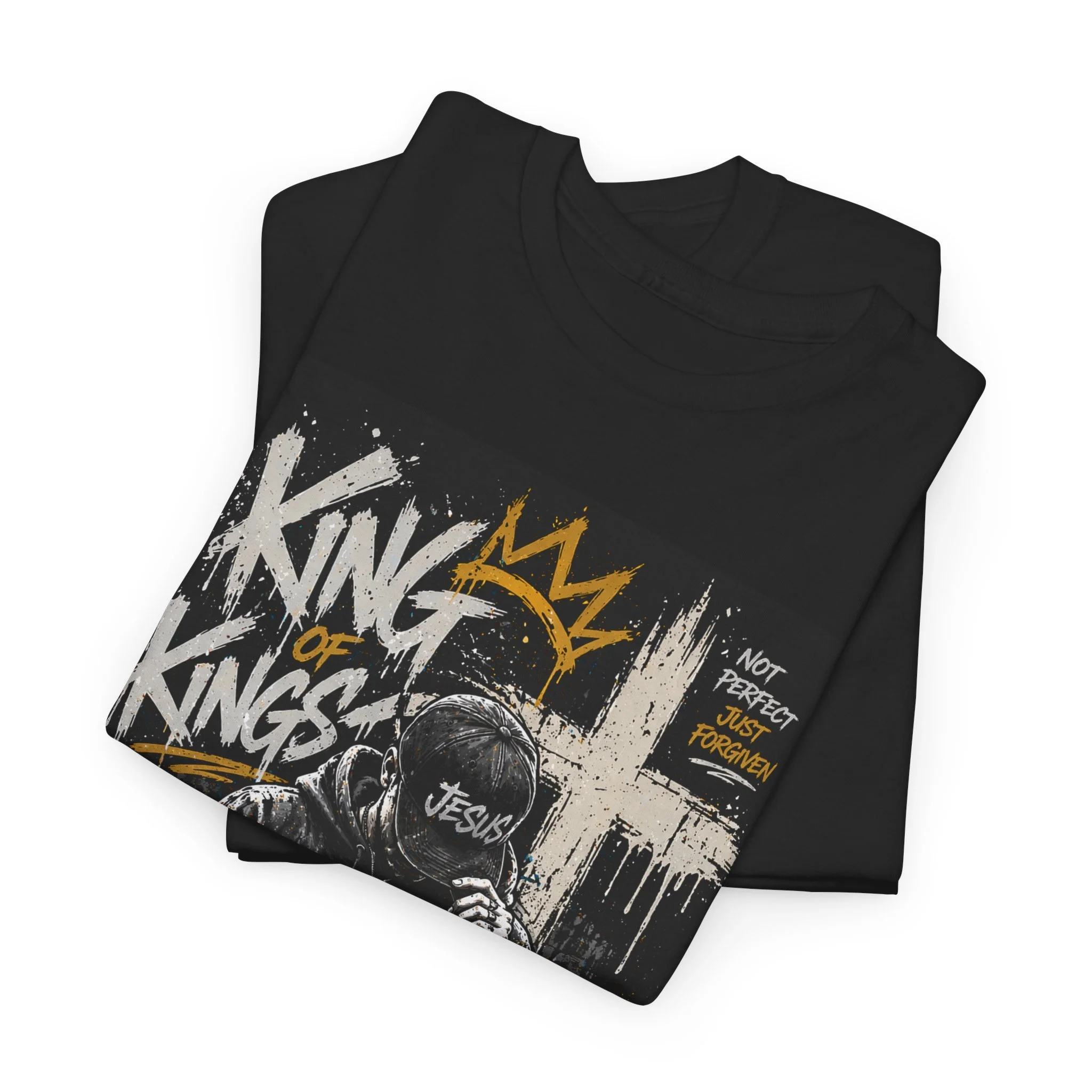 This heavyweight cotton tee carries a bold, streetwise message with a raw, hand-drawn graphic that reads like graffiti on a city wall. The black shirt makes the white and gold sketching pop — a crowned figure, scrawled text and layered paint marks create a look that feels defiant, faith-driven, and unapologetically urban. Wear it when you want clothing that speaks with attitude but stays comfortable: the classic crew neck and relaxed fit sit easy under a jacket or worn alone, while the tear-away label keeps you from fussing with tags. Thoughtful construction — reinforced shoulders, ribbed collar, and a smooth print surface — keeps the tee looking sharp wash after wash. It’s for people who want their beliefs voiced through style, and for evenings, meetups, or street worship moments where bold design matches a bold heart.
