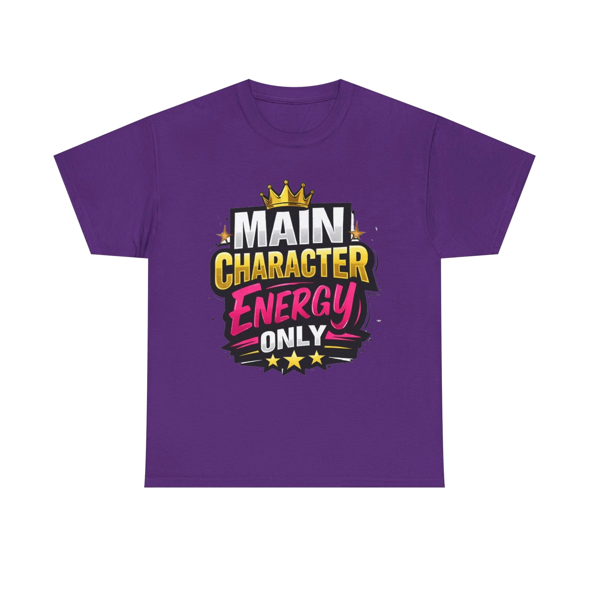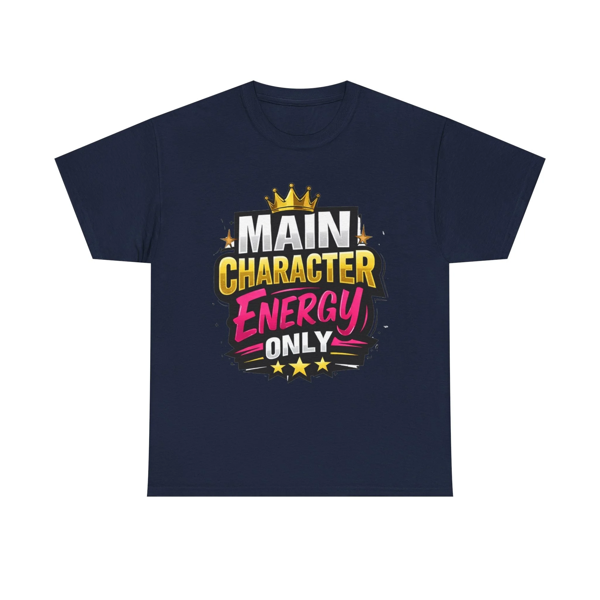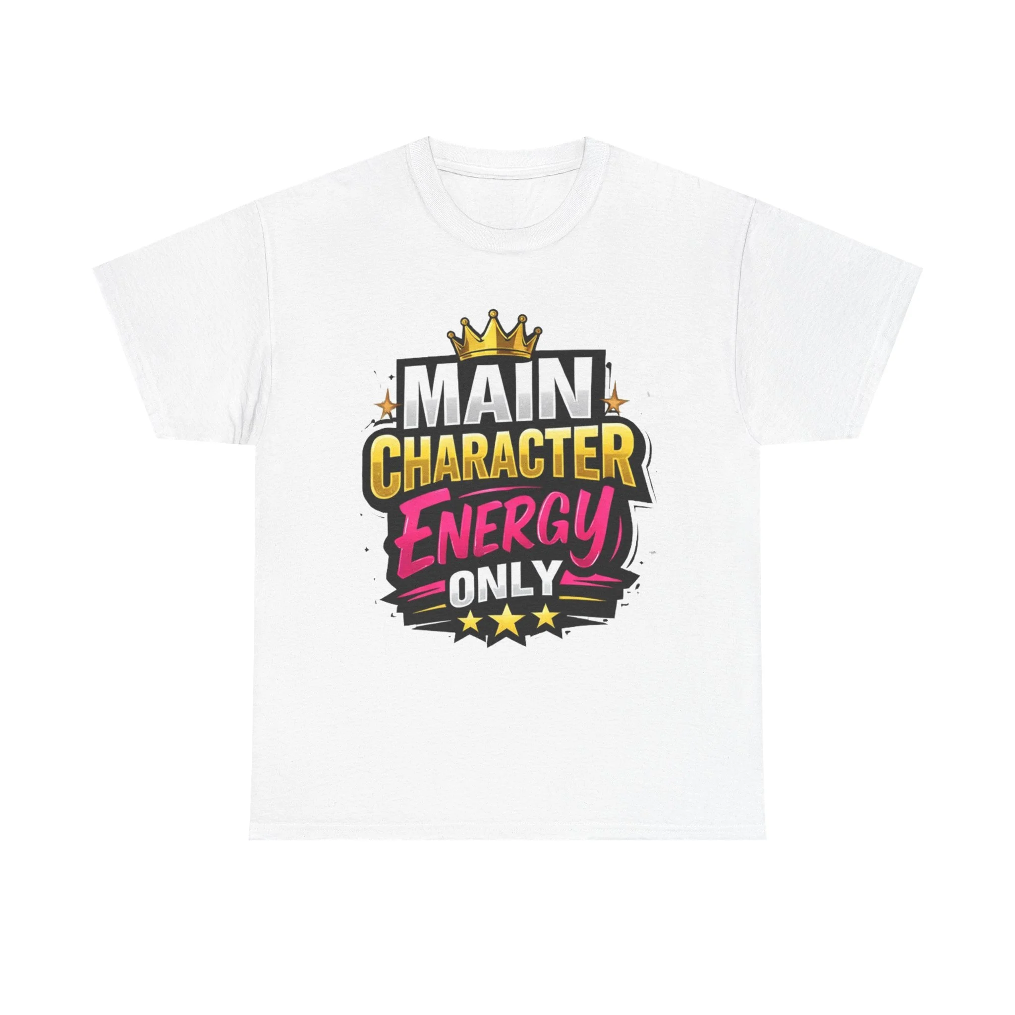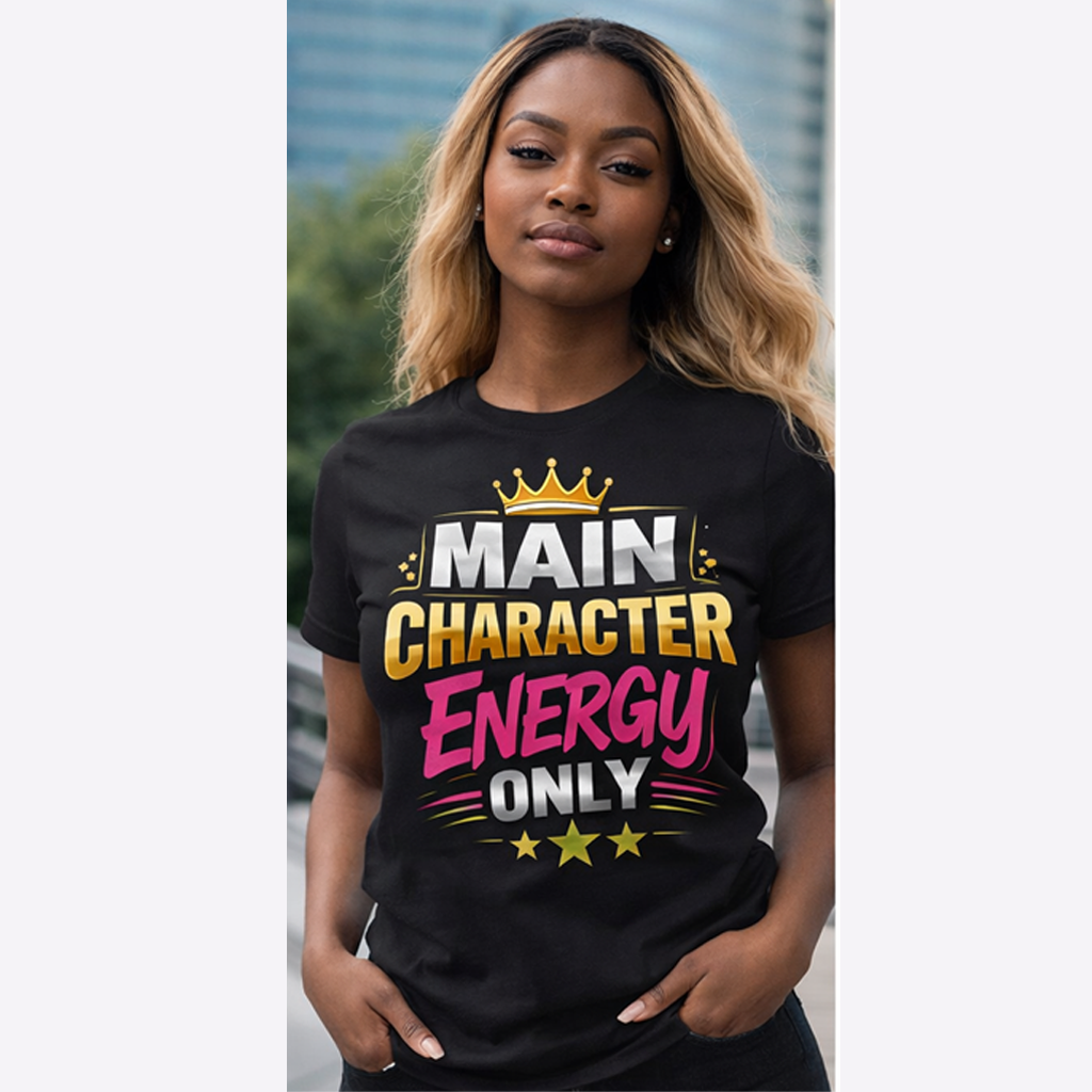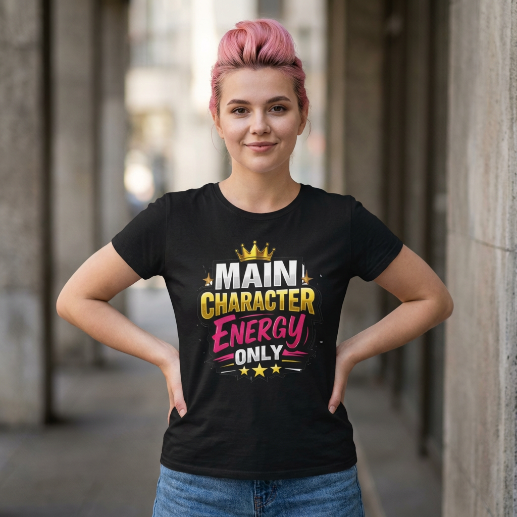 This cotton tee speaks loud without shouting. Bright, bold lettering—“MAIN CHARACTER ENERGY ONLY”—sits like a neon proclamation against a clean white canvas. The crown and star accents add playful swagger, while the vibrant pink and gold palette makes the design pop in sunlight or stage lights. Wear it when you want your presence noticed: strolling city nights, meeting friends for coffee, or layering under a denim jacket for weekend adventures. The shirt settles into everyday life easily: comfortable, breathable, and confident. It’s for people who move through rooms as if they belong in the center of the story, who enjoy a little theatrical flair and a lot of casual comfort.