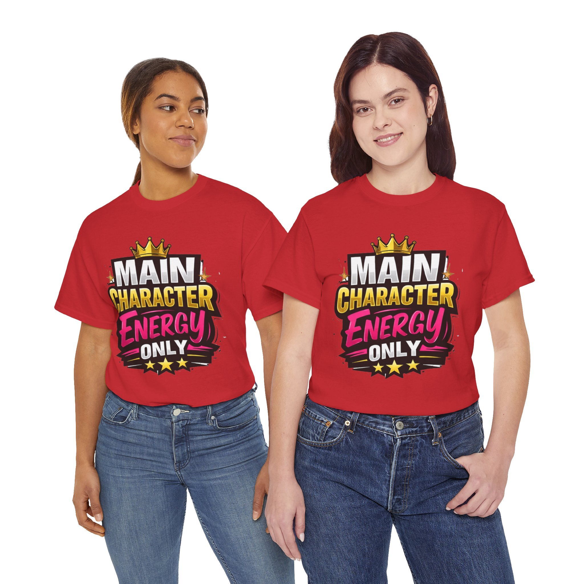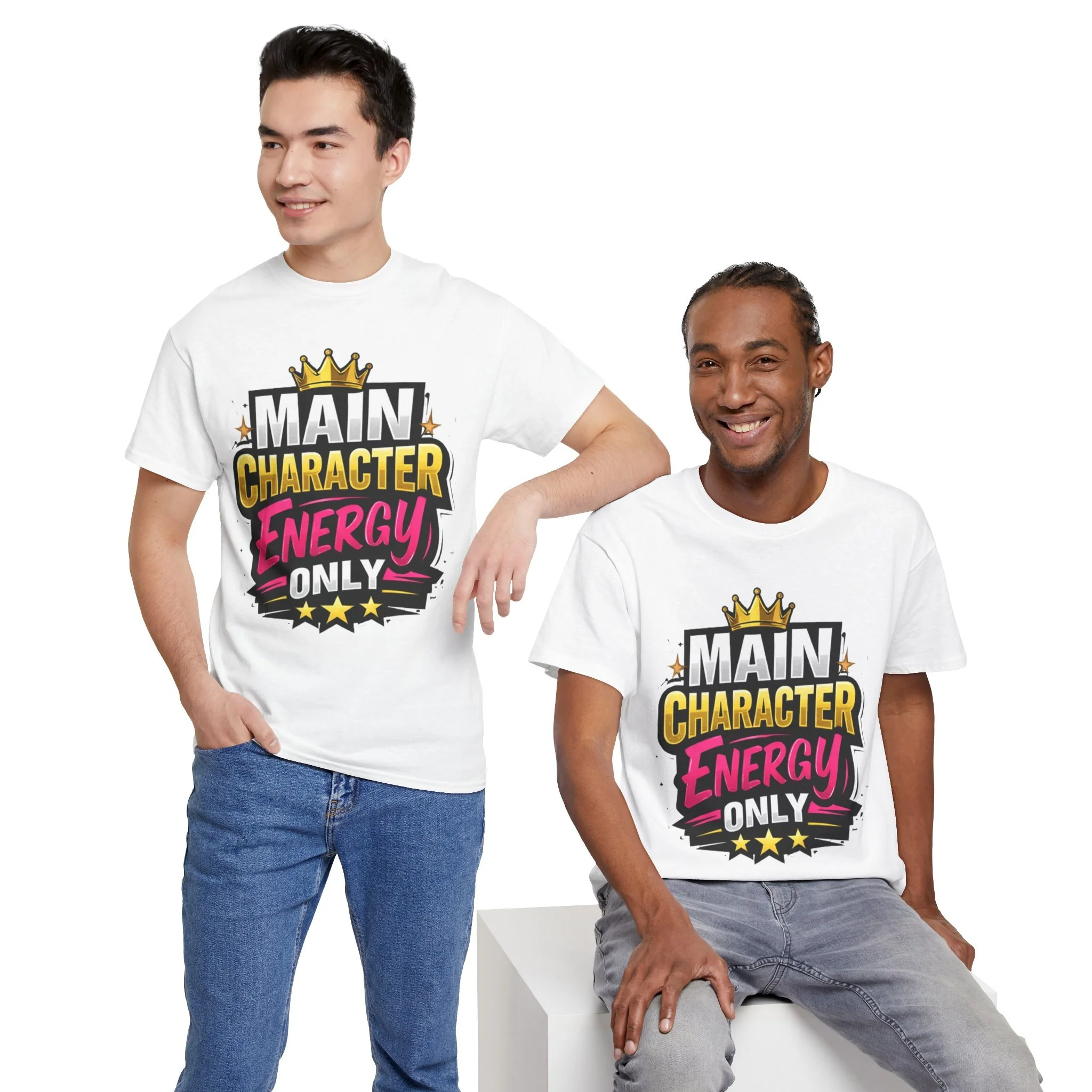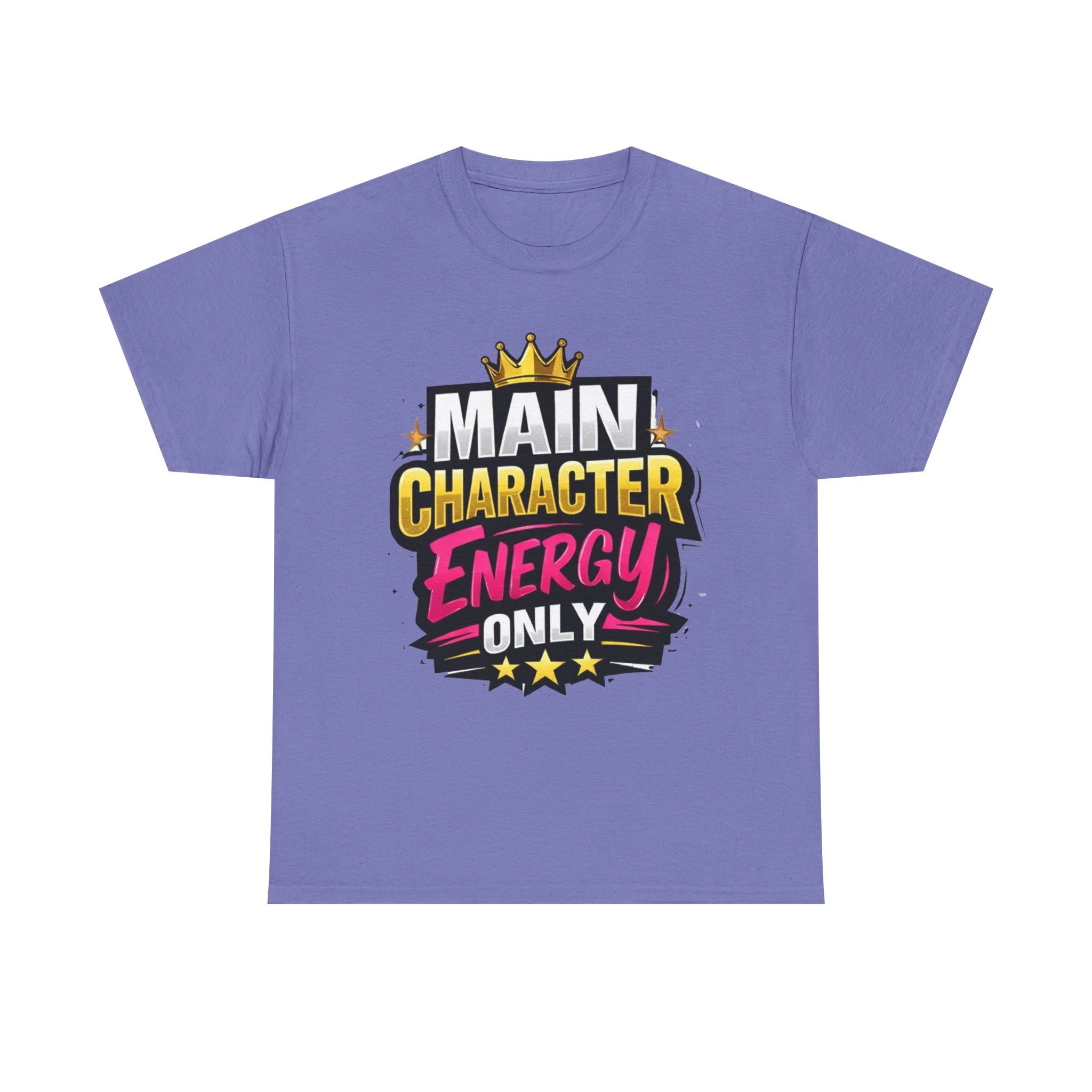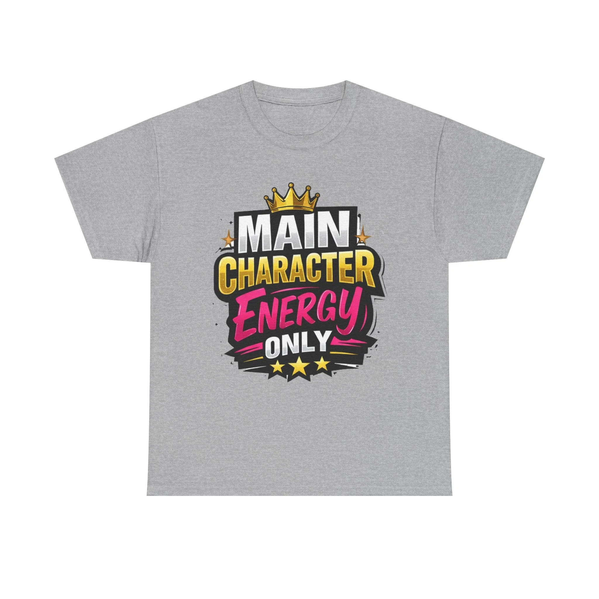 This cotton tee speaks loud without shouting. Bright, bold lettering—“MAIN CHARACTER ENERGY ONLY”—sits like a neon proclamation against a clean white canvas. The crown and star accents add playful swagger, while the vibrant pink and gold palette makes the design pop in sunlight or stage lights. Wear it when you want your presence noticed: strolling city nights, meeting friends for coffee, or layering under a denim jacket for weekend adventures. The shirt settles into everyday life easily: comfortable, breathable, and confident. It’s for people who move through rooms as if they belong in the center of the story, who enjoy a little theatrical flair and a lot of casual comfort.