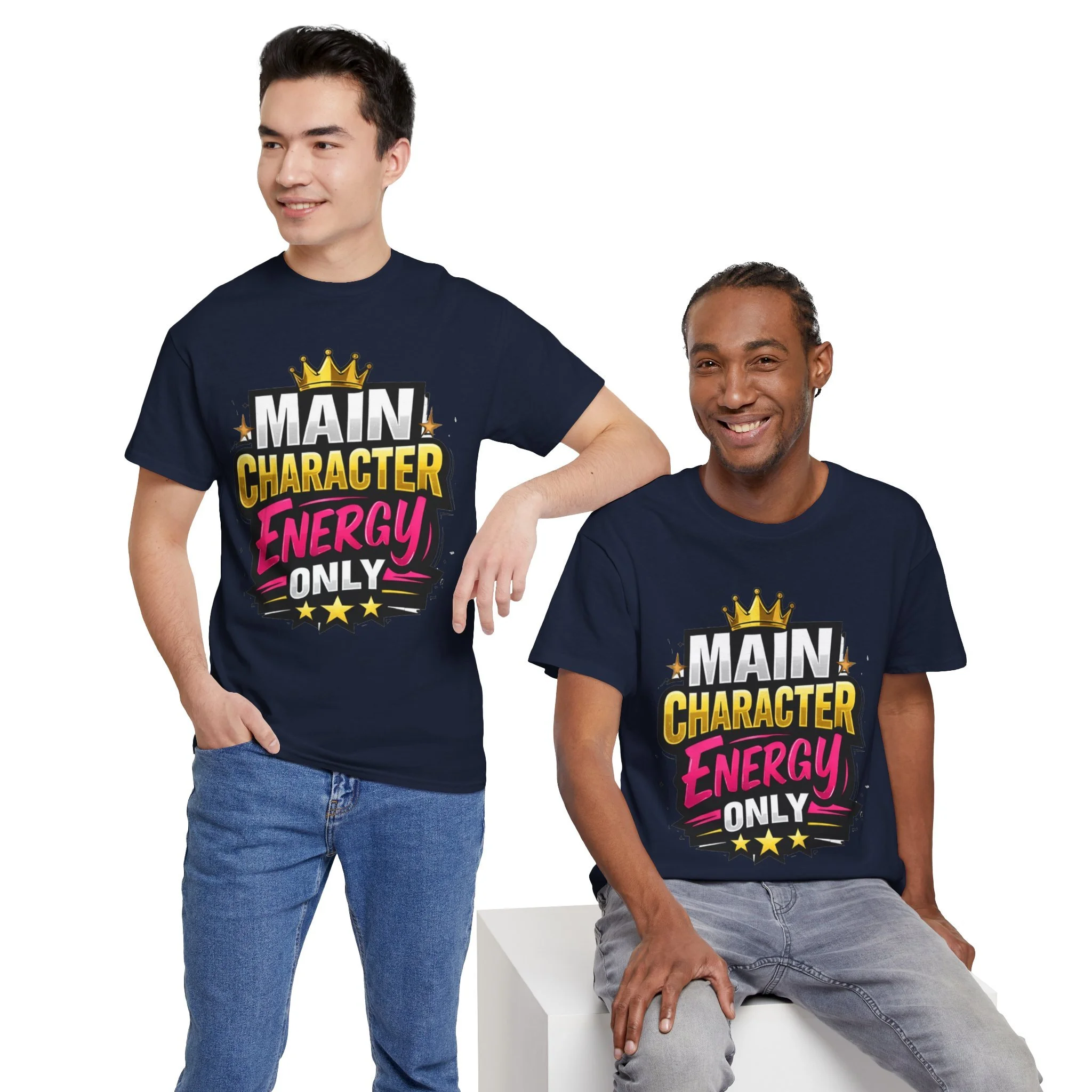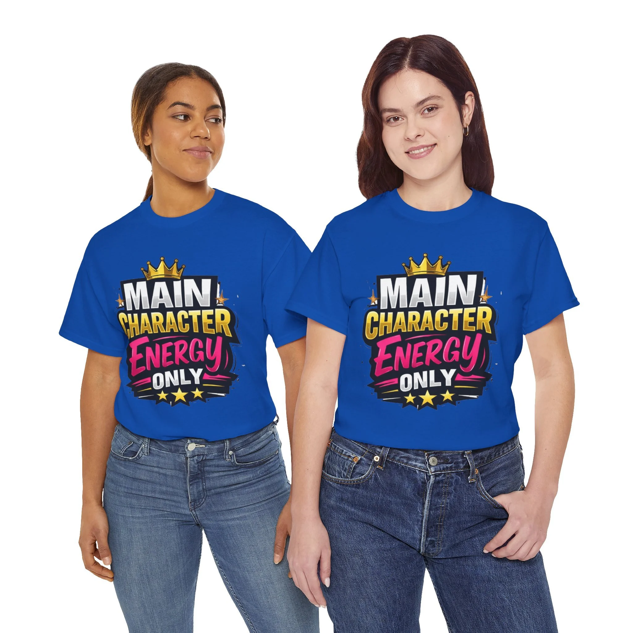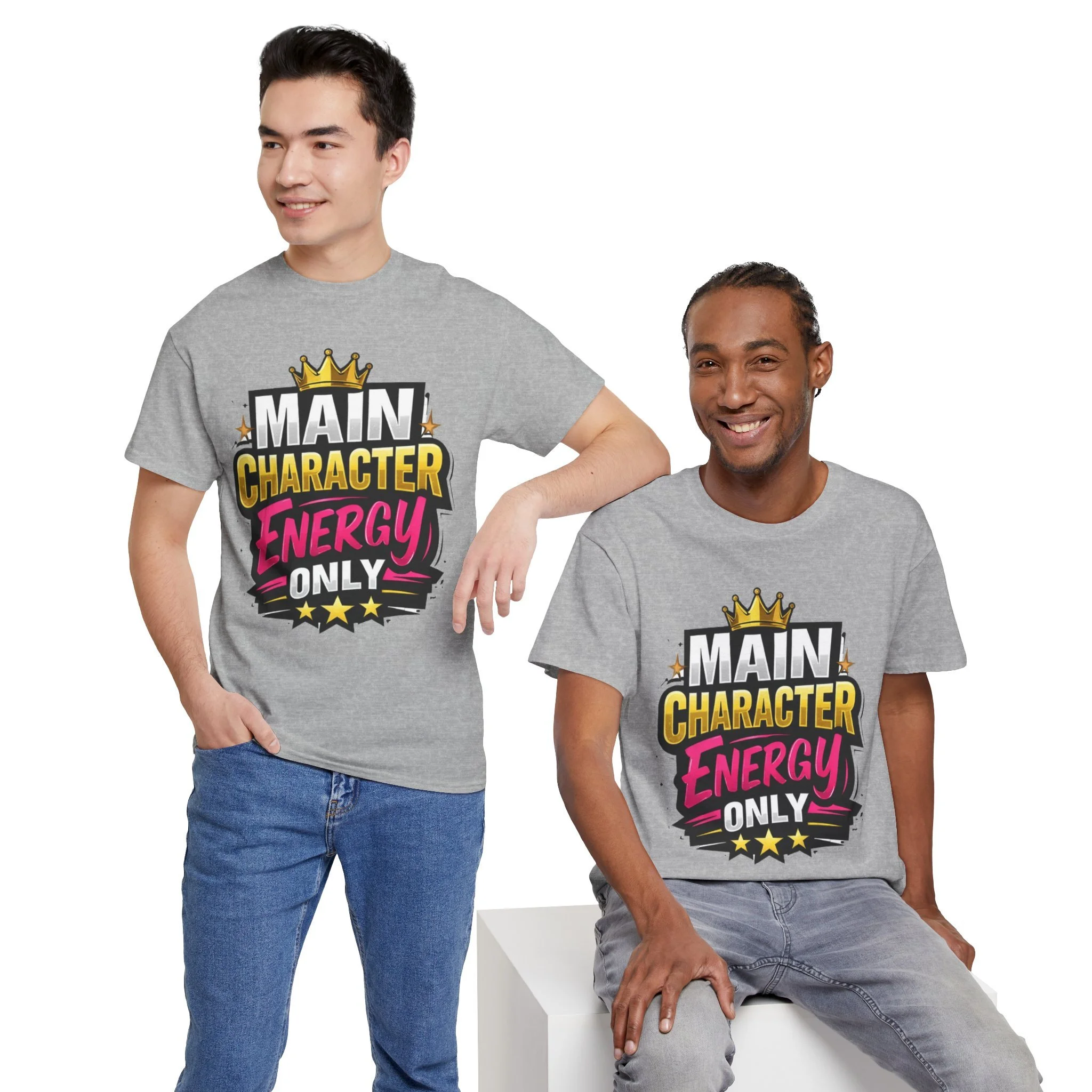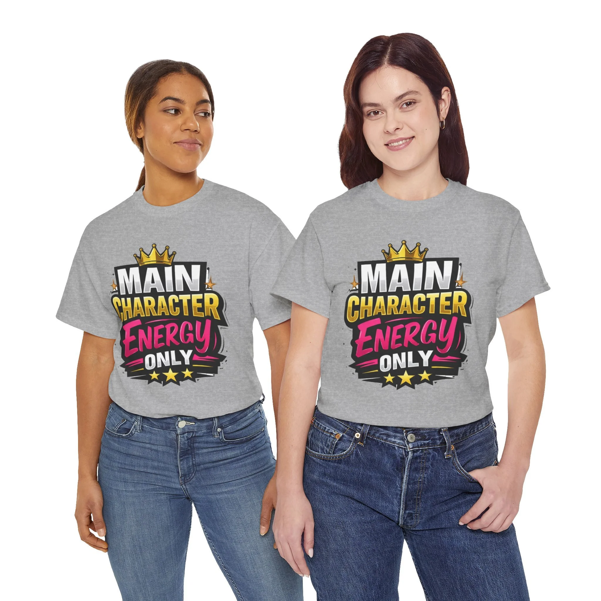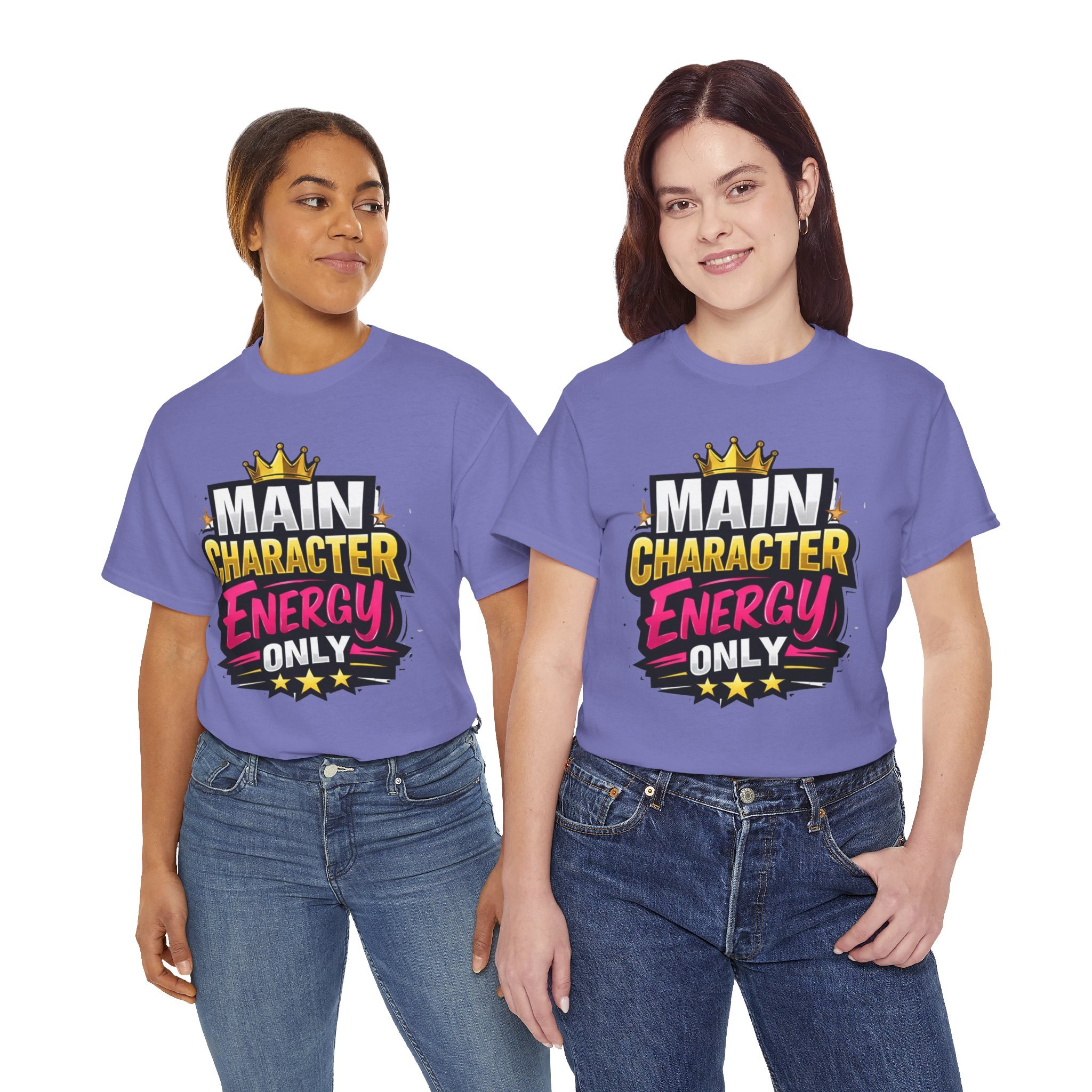 This cotton tee speaks loud without shouting. Bright, bold lettering—“MAIN CHARACTER ENERGY ONLY”—sits like a neon proclamation against a clean white canvas. The crown and star accents add playful swagger, while the vibrant pink and gold palette makes the design pop in sunlight or stage lights. Wear it when you want your presence noticed: strolling city nights, meeting friends for coffee, or layering under a denim jacket for weekend adventures. The shirt settles into everyday life easily: comfortable, breathable, and confident. It’s for people who move through rooms as if they belong in the center of the story, who enjoy a little theatrical flair and a lot of casual comfort.