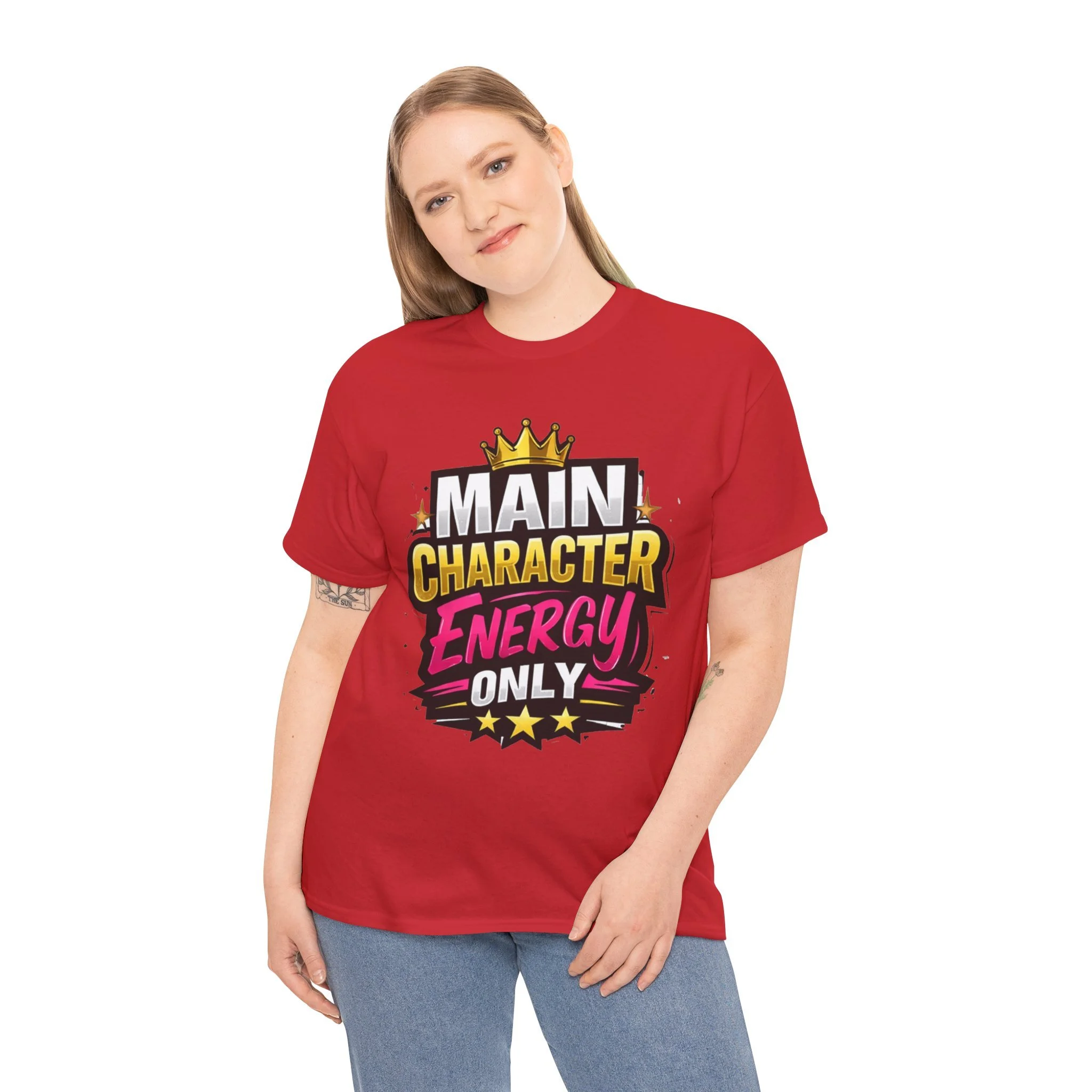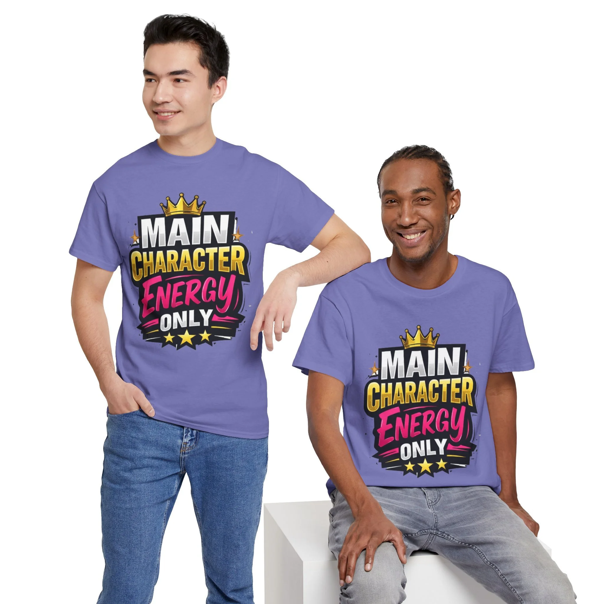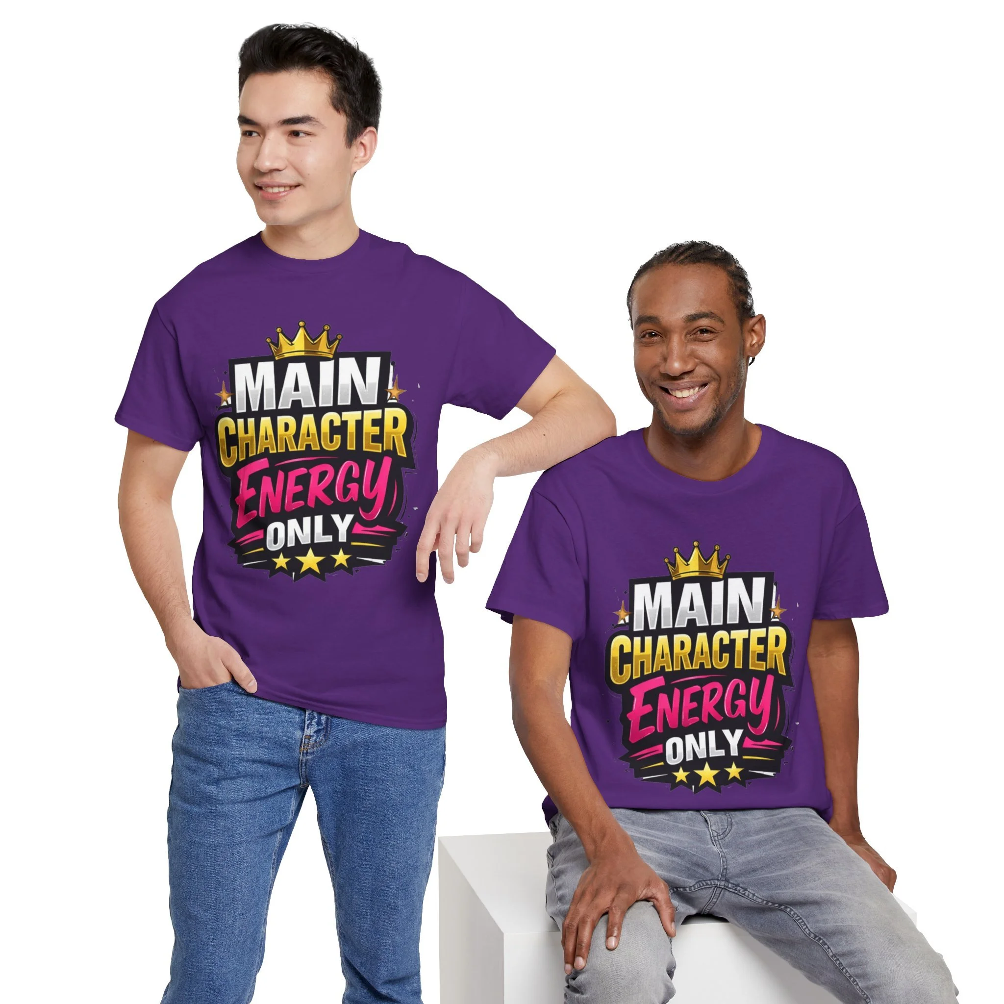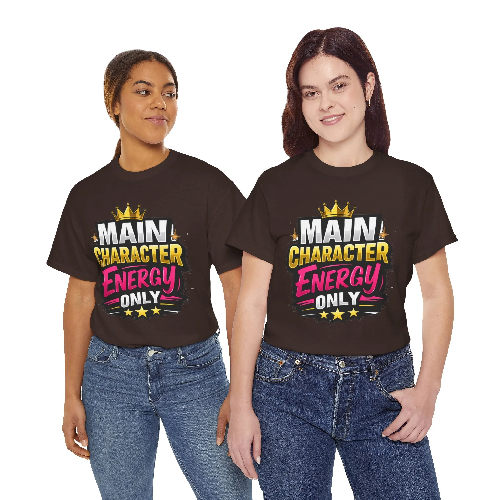 This cotton tee speaks loud without shouting. Bright, bold lettering—“MAIN CHARACTER ENERGY ONLY”—sits like a neon proclamation against a clean white canvas. The crown and star accents add playful swagger, while the vibrant pink and gold palette makes the design pop in sunlight or stage lights. Wear it when you want your presence noticed: strolling city nights, meeting friends for coffee, or layering under a denim jacket for weekend adventures. The shirt settles into everyday life easily: comfortable, breathable, and confident. It’s for people who move through rooms as if they belong in the center of the story, who enjoy a little theatrical flair and a lot of casual comfort.