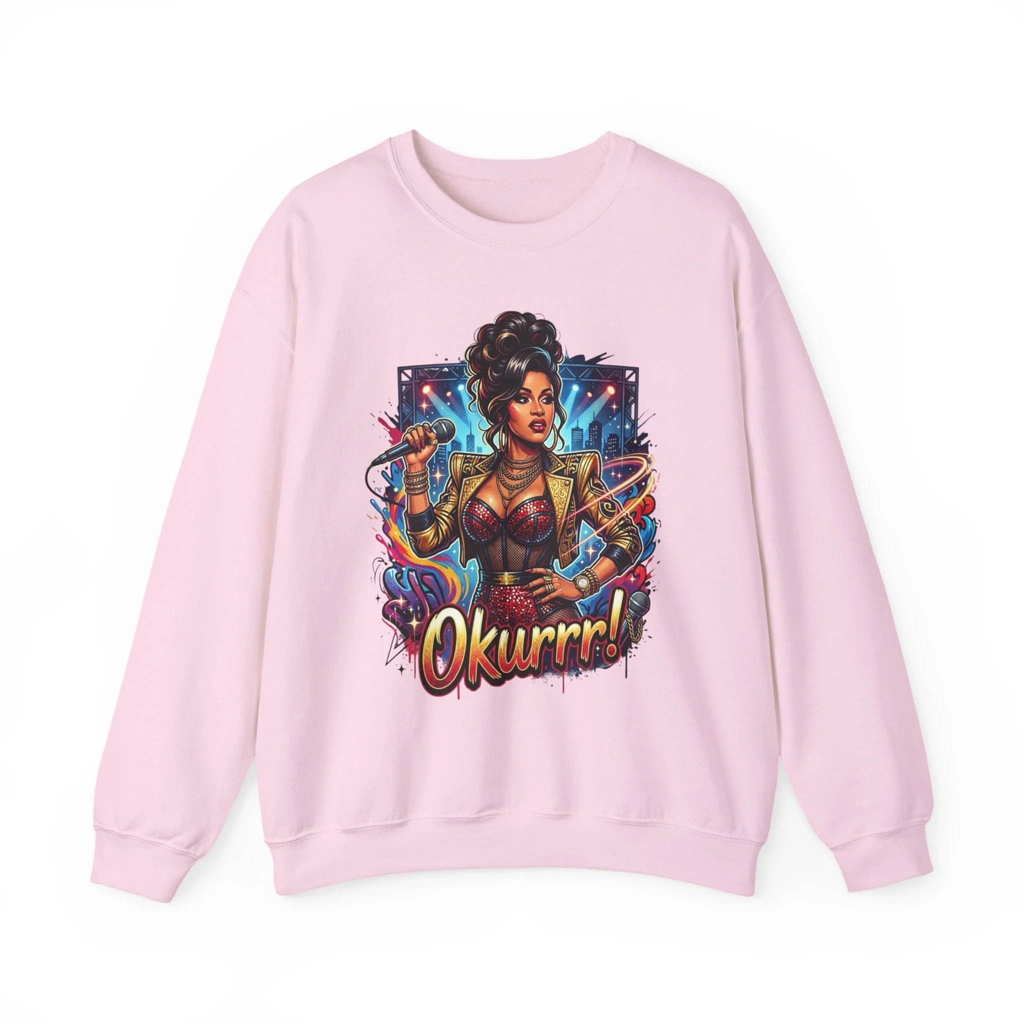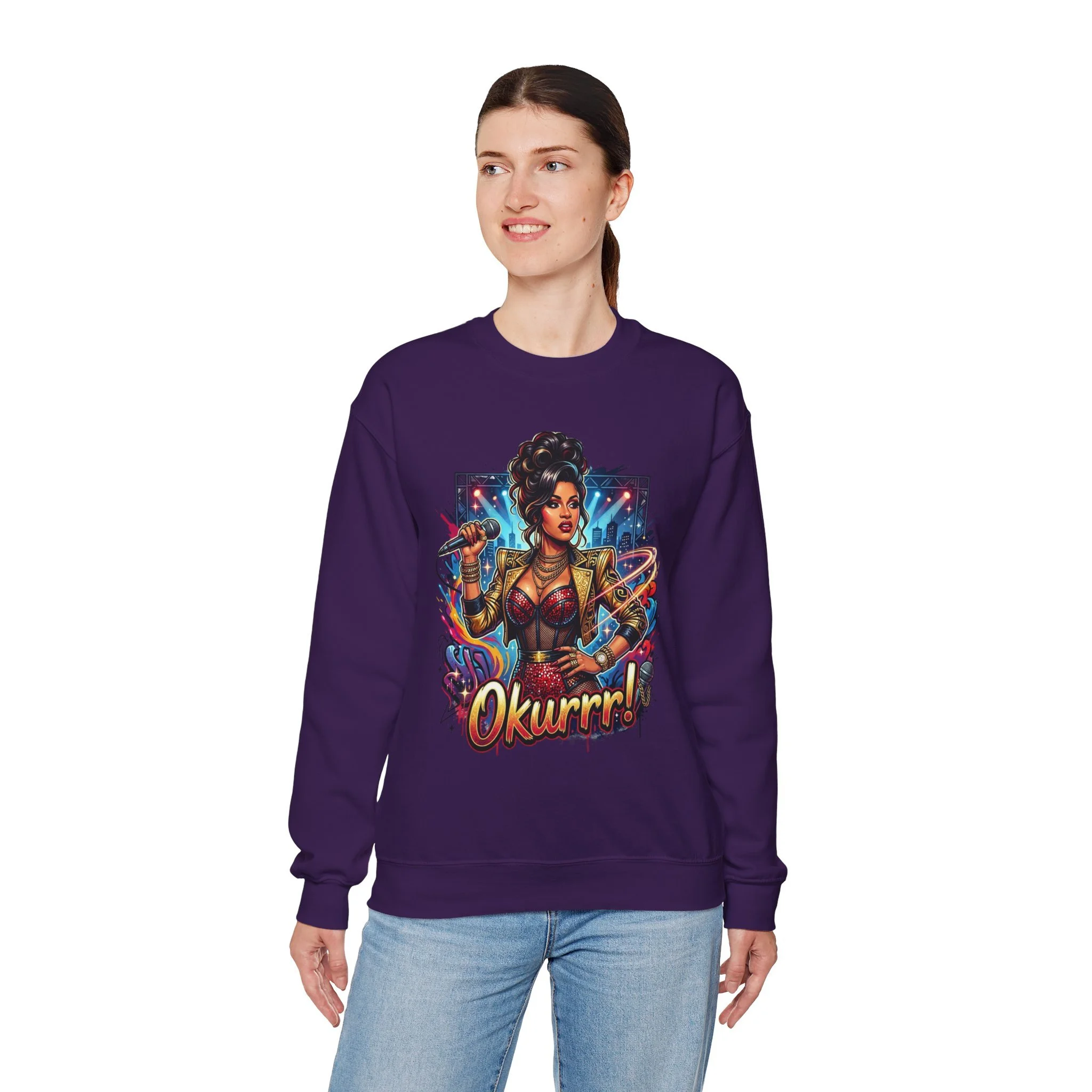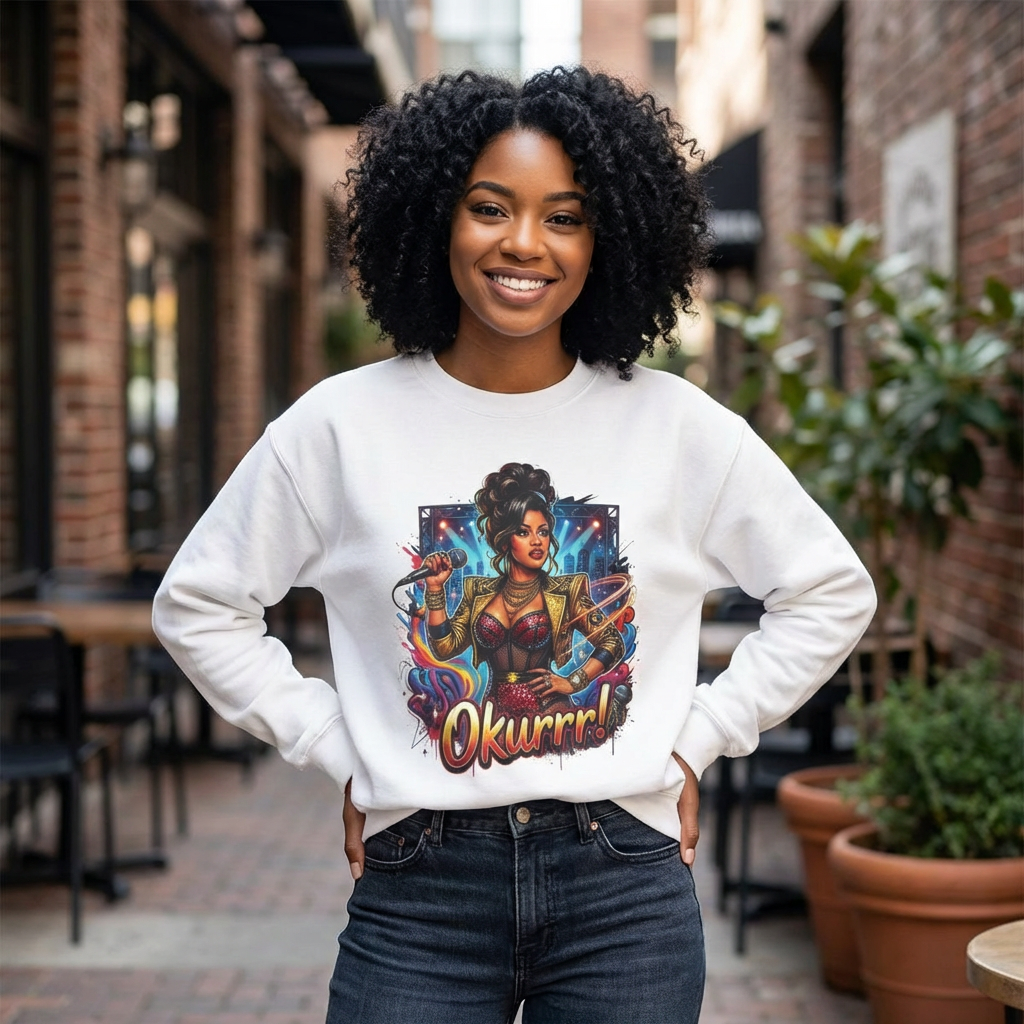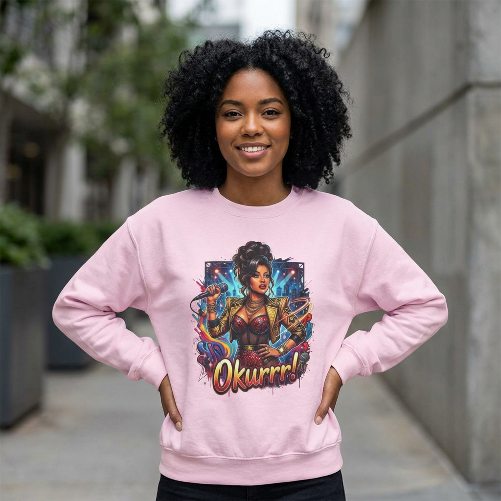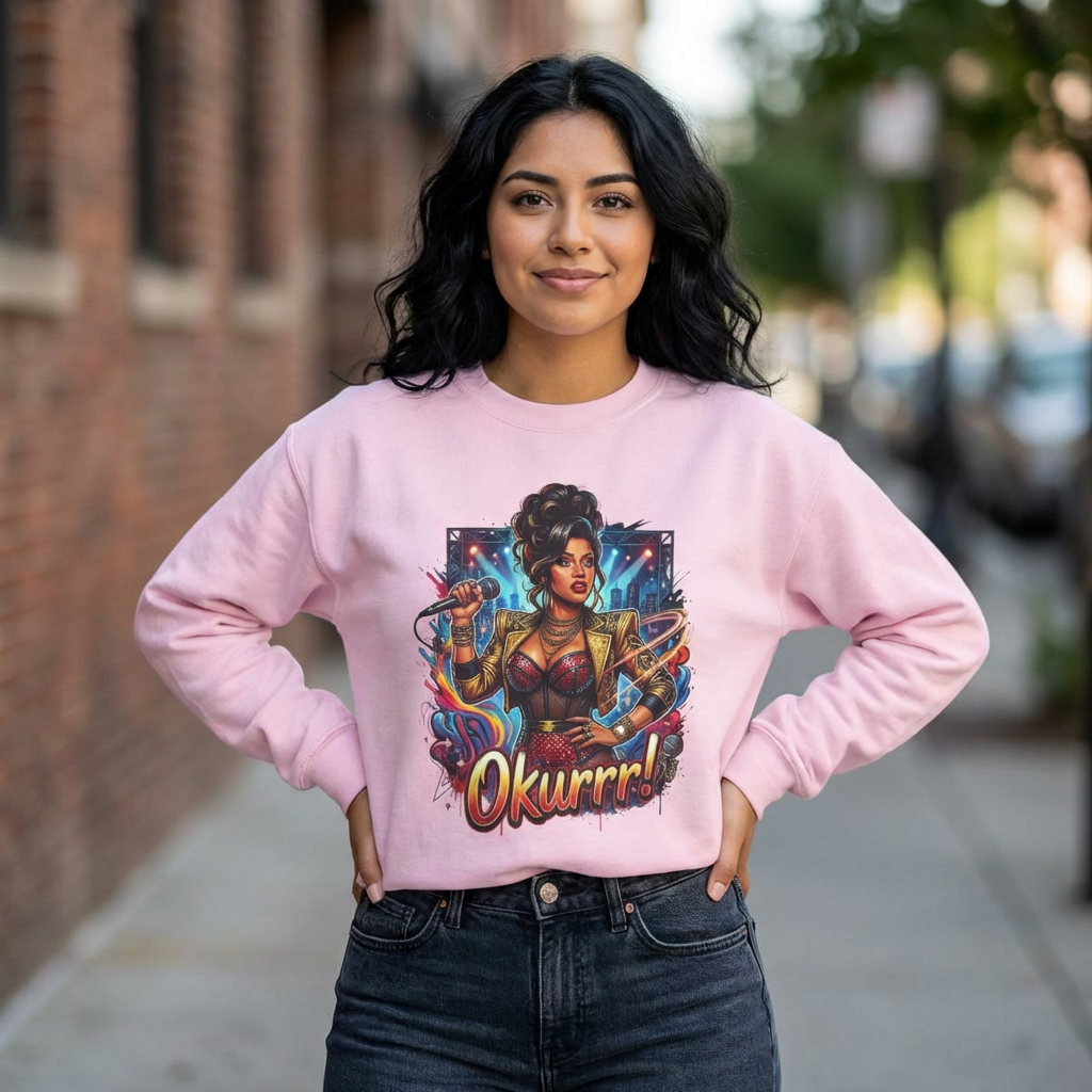 A soft, roomy sweatshirt that carries attitude and color. This crewneck features a bold, comic-style illustration of a confident, glam figure surrounded by dynamic energy—complete with the playful shout “Okurrr!” underneath. The medium-heavy 50/50 cotton-poly blend gives a cozy, lived-in feel while keeping the print vivid and crisp. Wear it as a statement layer on cool evenings, during creative hangouts, or when you want to bring sparkle to everyday moments. The tubular knit and ribbed collar keep the shape steady wash after wash, and the tear-away label removes that annoying itch. Thoughtful construction and OEKO-TEX dyes mean the piece feels as good as it looks.