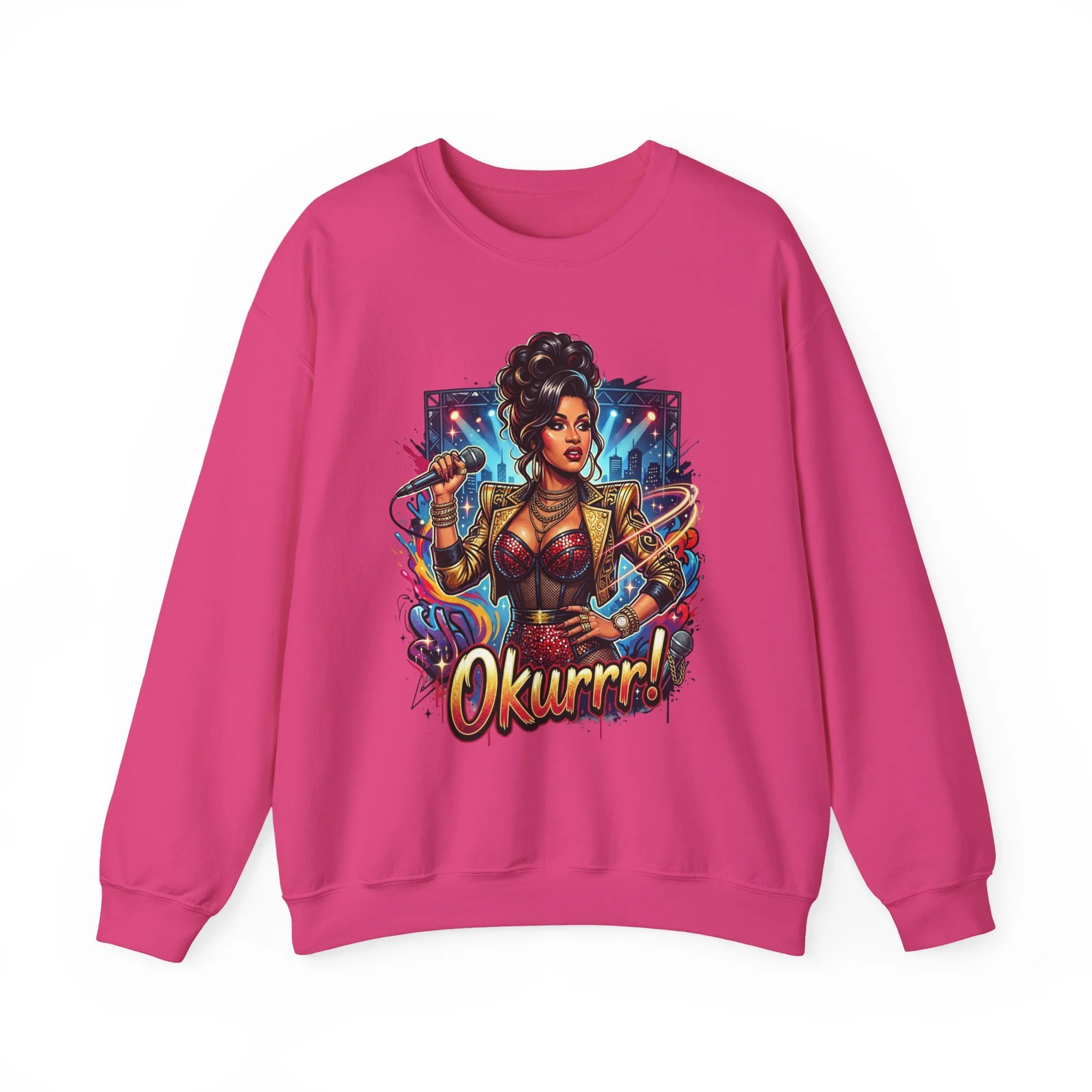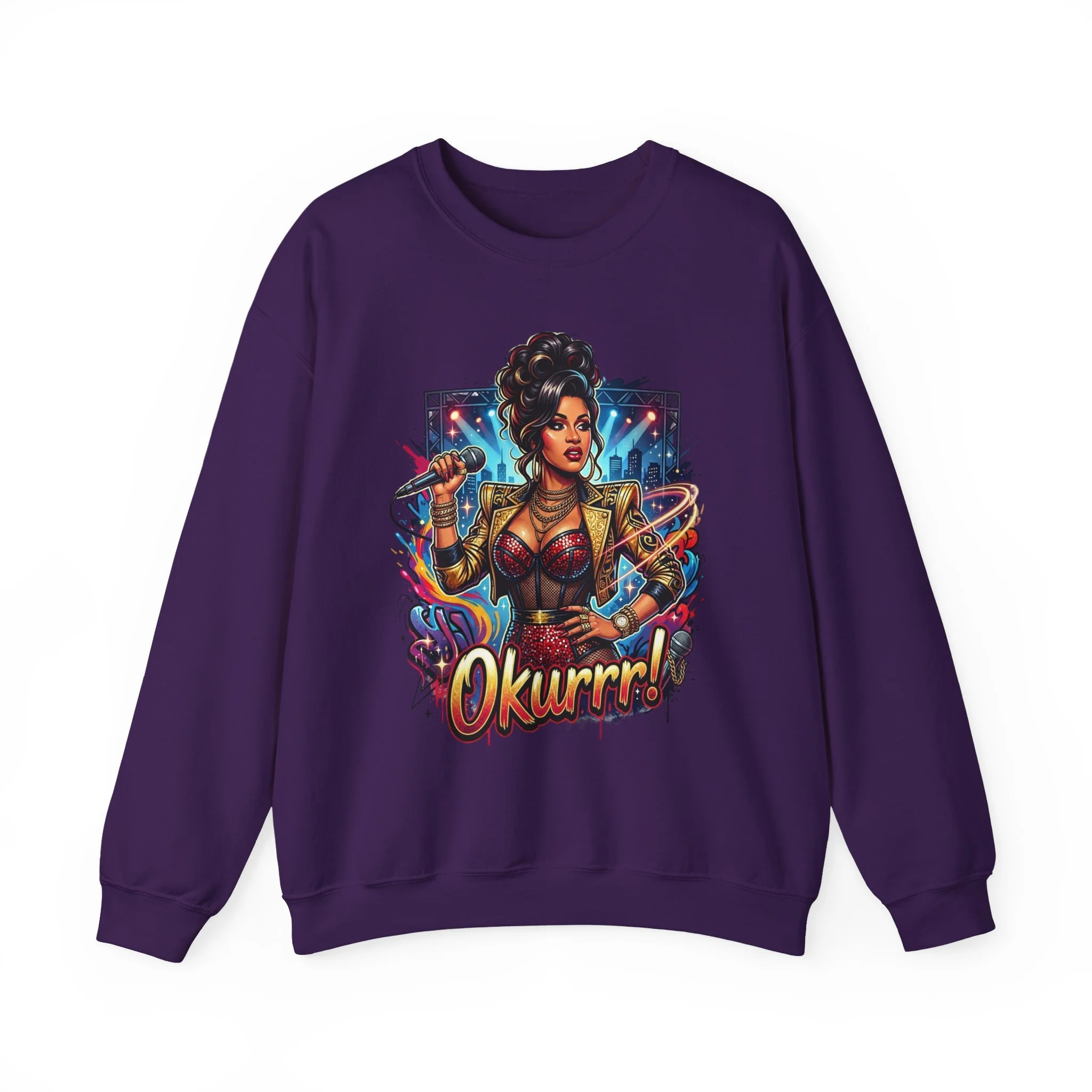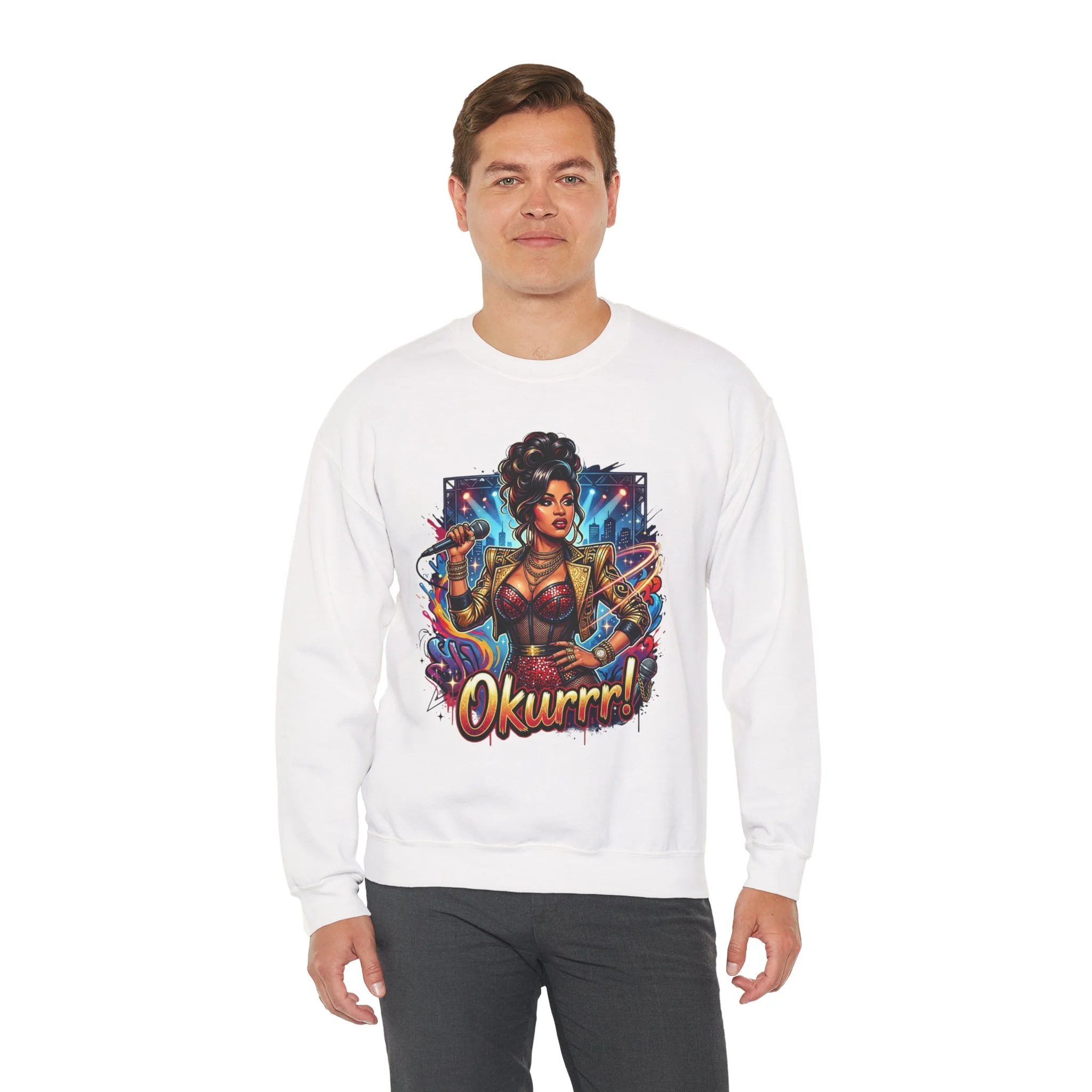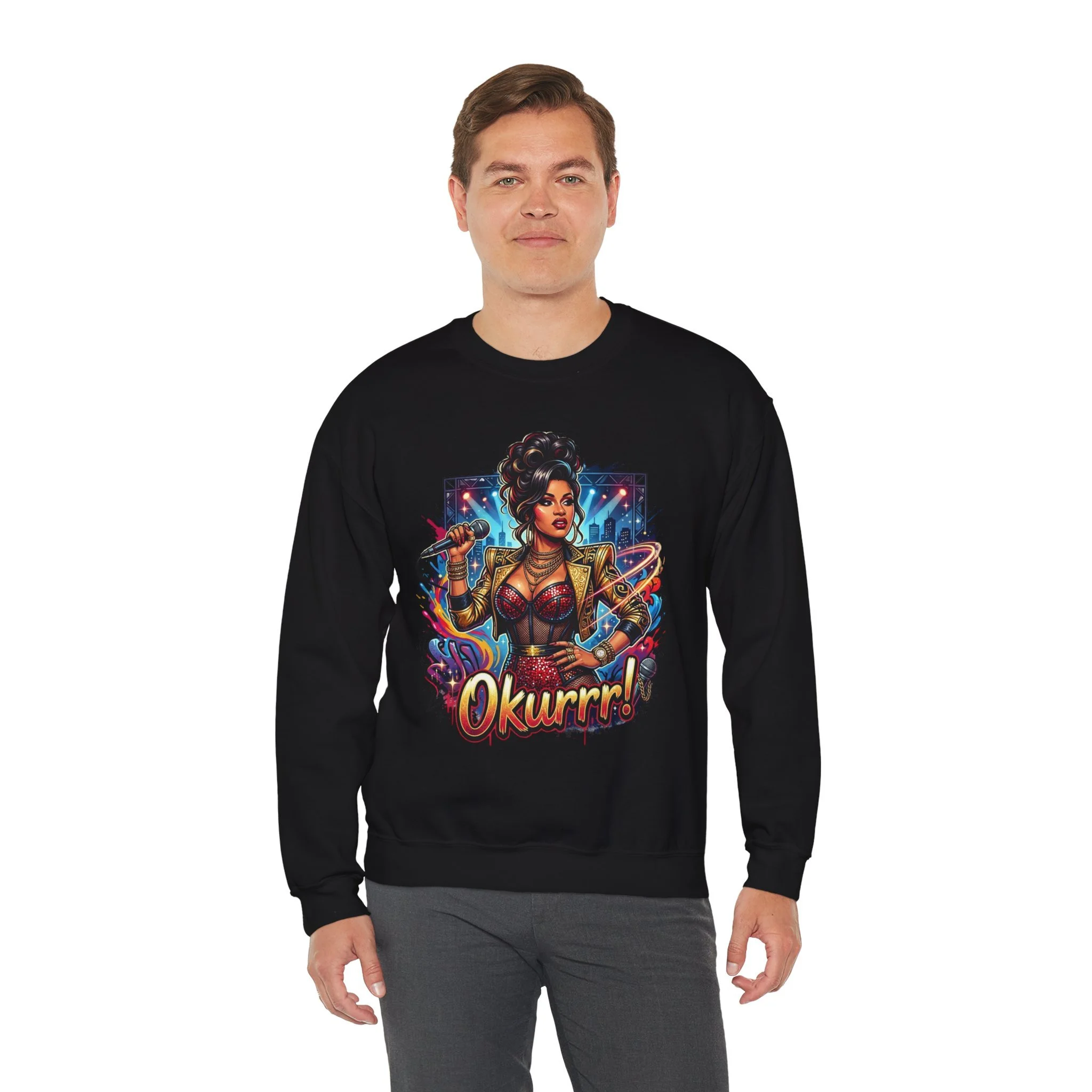 A soft, roomy sweatshirt that carries attitude and color. This crewneck features a bold, comic-style illustration of a confident, glam figure surrounded by dynamic energy—complete with the playful shout “Okurrr!” underneath. The medium-heavy 50/50 cotton-poly blend gives a cozy, lived-in feel while keeping the print vivid and crisp. Wear it as a statement layer on cool evenings, during creative hangouts, or when you want to bring sparkle to everyday moments. The tubular knit and ribbed collar keep the shape steady wash after wash, and the tear-away label removes that annoying itch. Thoughtful construction and OEKO-TEX dyes mean the piece feels as good as it looks.