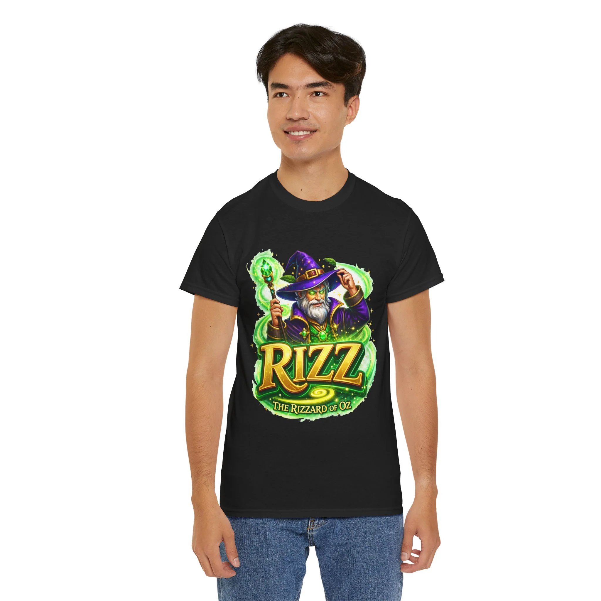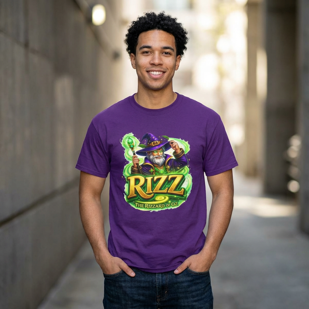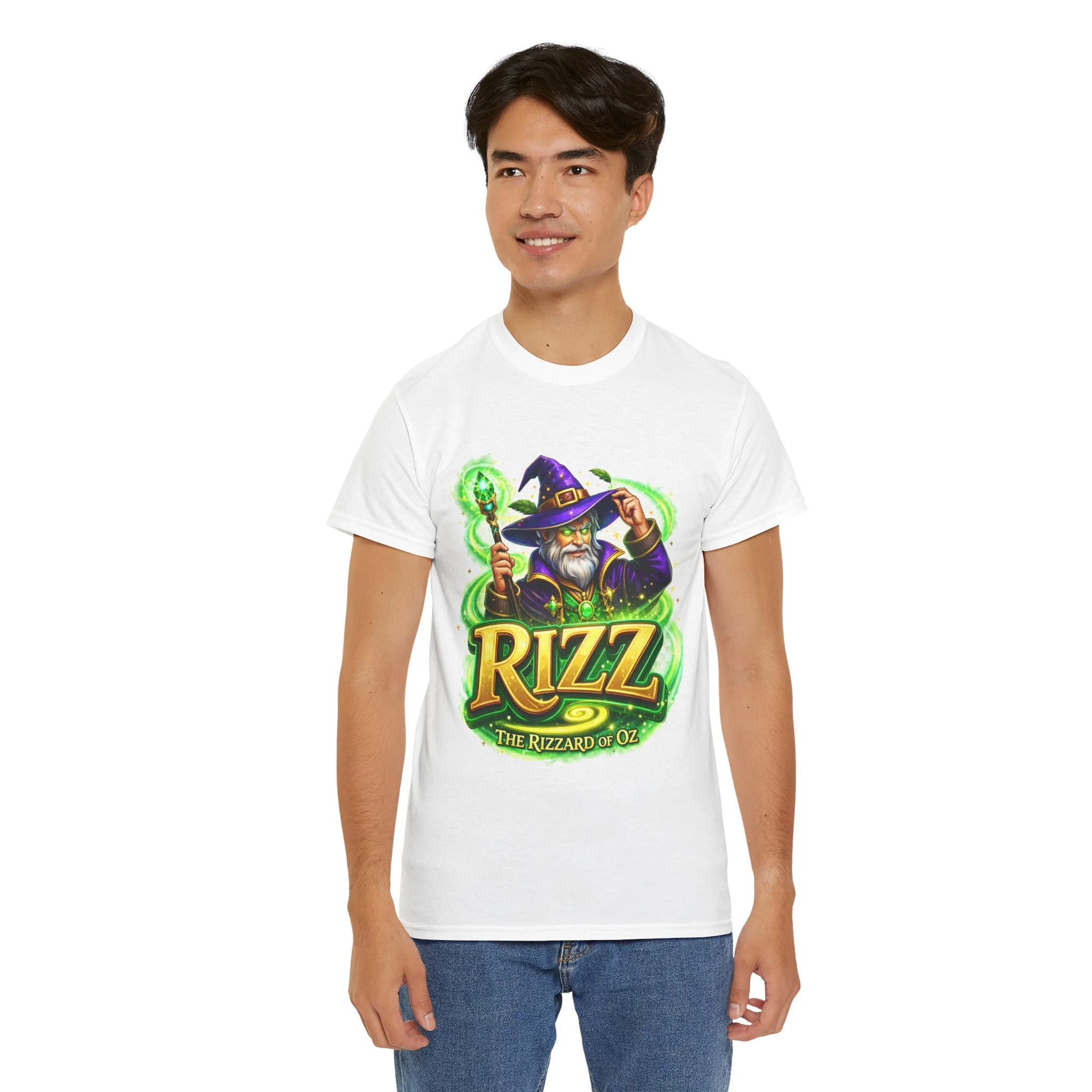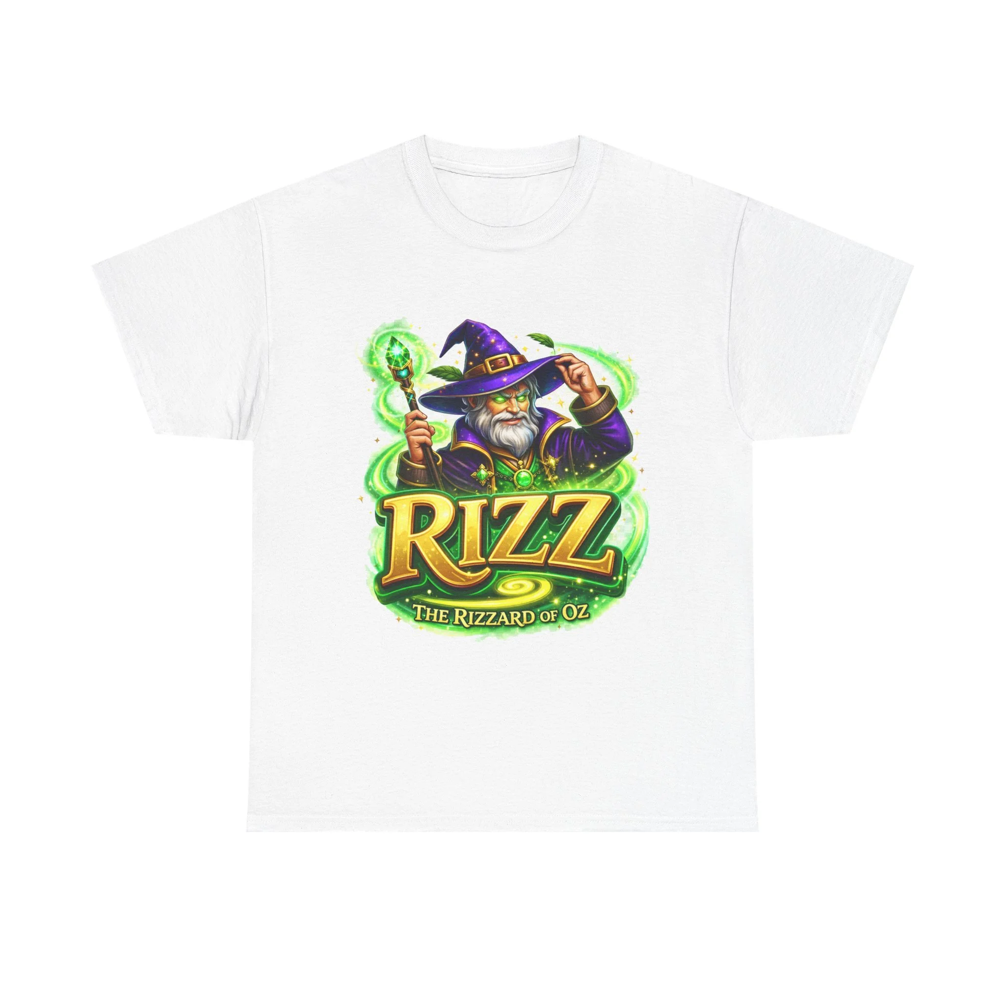 A soft, classic cotton tee printed with a bold, playful wizard illustration and bright, arcade-style lettering. The image centers on a robed wizard casting neon-green magic above the name “RIZZ,” surrounded by energetic swirls and a rich color palette that pops on the clean white fabric. Wearers will feel whimsical and nostalgic—this shirt reads like a badge for folks who love game-inspired art and tongue-in-cheek fantasy. The relaxed crew-neck cut and tear-away label keep it comfortable for long wear, while dual printing methods preserve crisp detail through washes. It’s a casual layer that brings personality to game nights, conventions, or everyday streetwear for fans of retro-fantasy visuals.