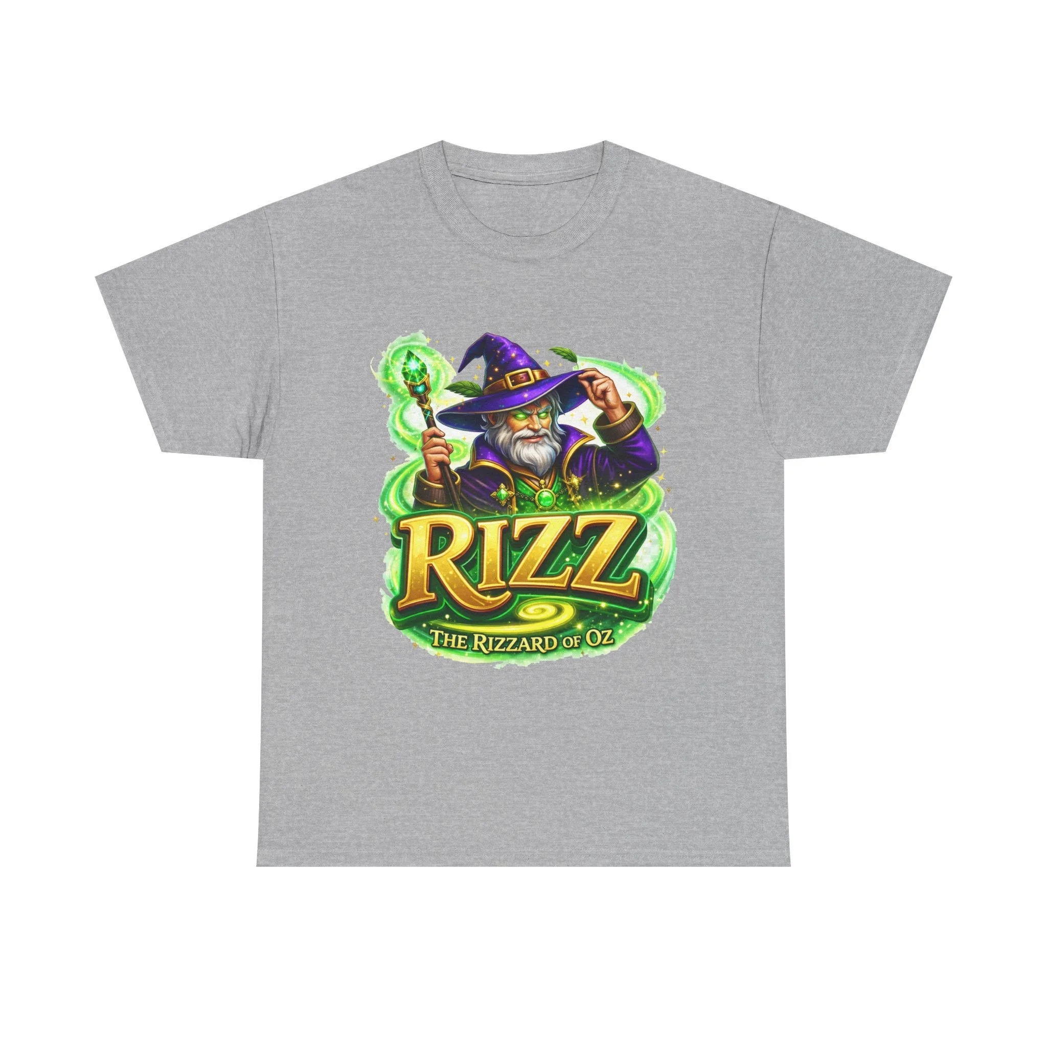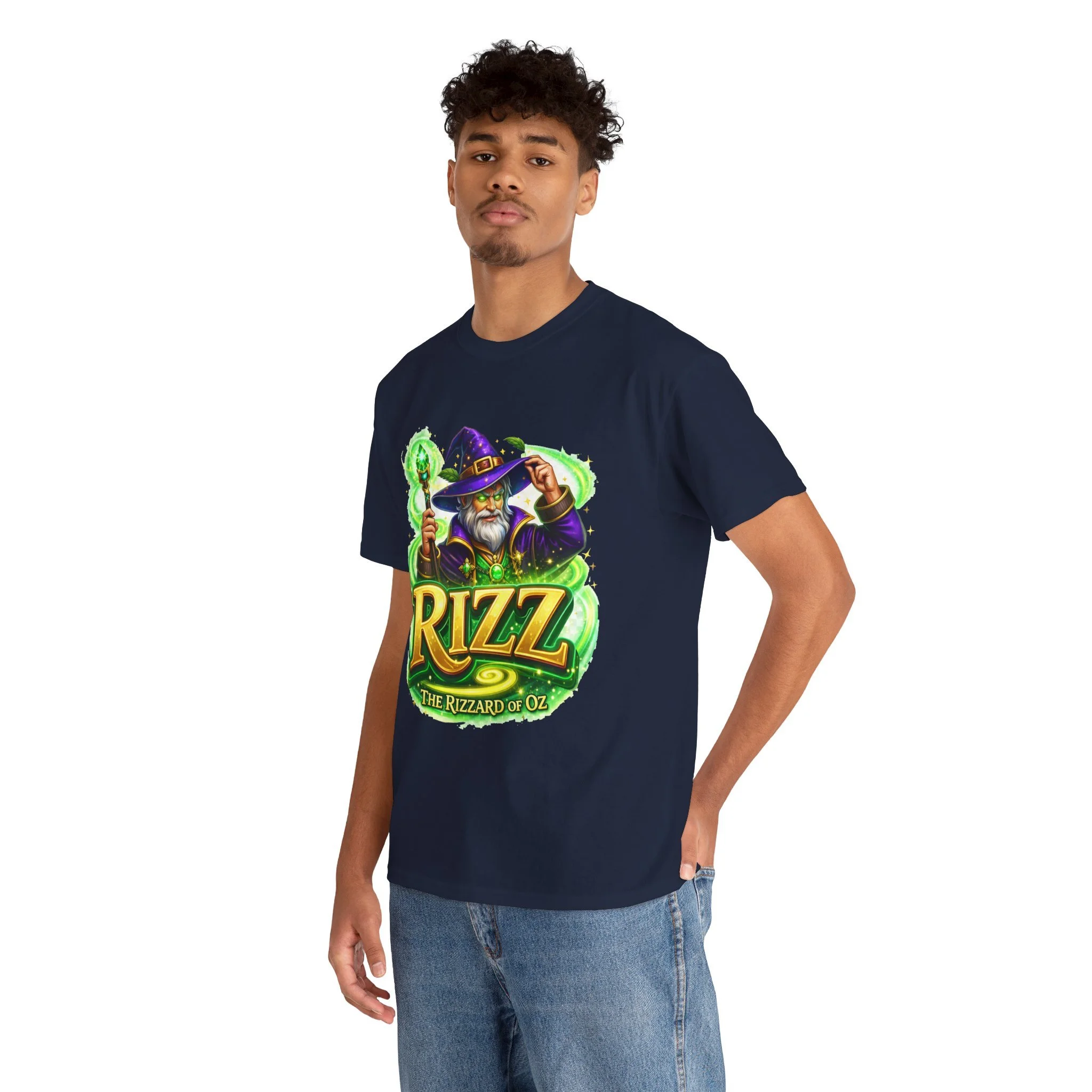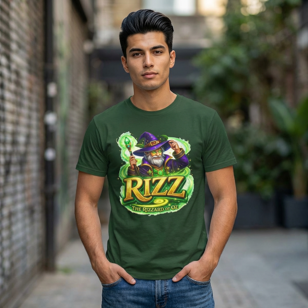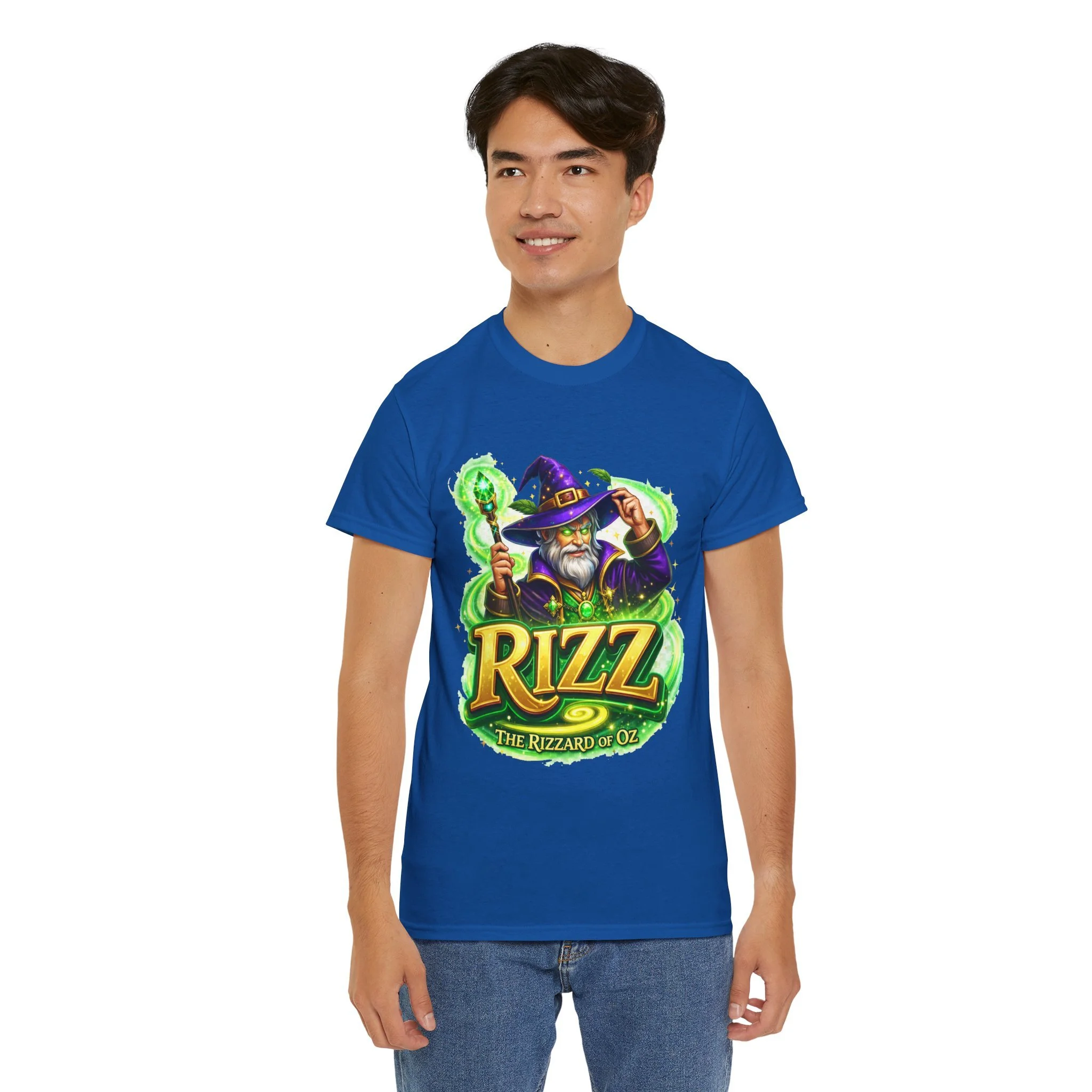 A soft, classic cotton tee printed with a bold, playful wizard illustration and bright, arcade-style lettering. The image centers on a robed wizard casting neon-green magic above the name “RIZZ,” surrounded by energetic swirls and a rich color palette that pops on the clean white fabric. Wearers will feel whimsical and nostalgic—this shirt reads like a badge for folks who love game-inspired art and tongue-in-cheek fantasy. The relaxed crew-neck cut and tear-away label keep it comfortable for long wear, while dual printing methods preserve crisp detail through washes. It’s a casual layer that brings personality to game nights, conventions, or everyday streetwear for fans of retro-fantasy visuals.