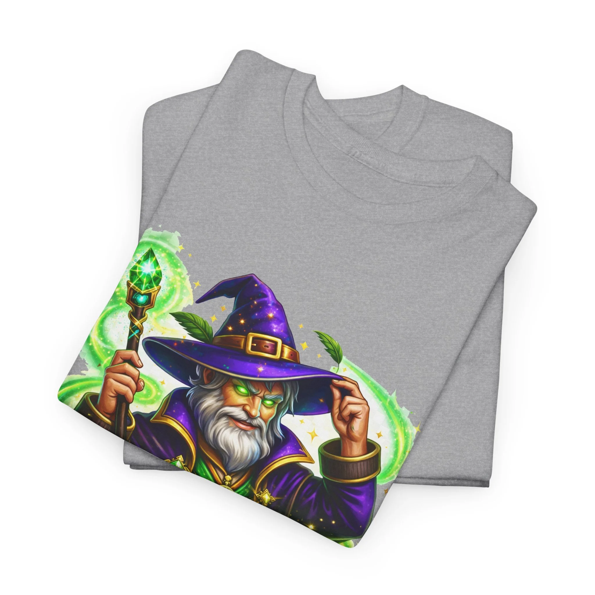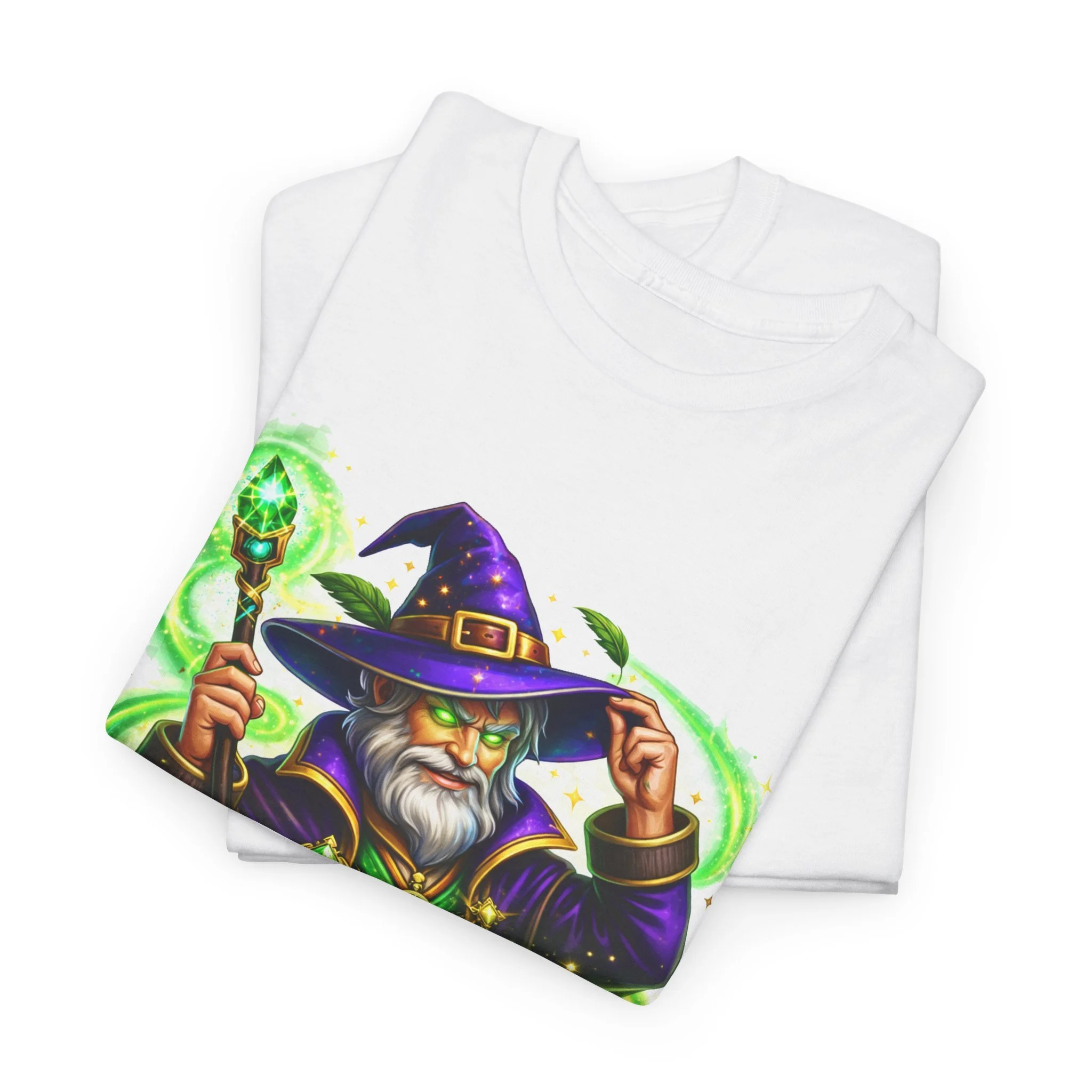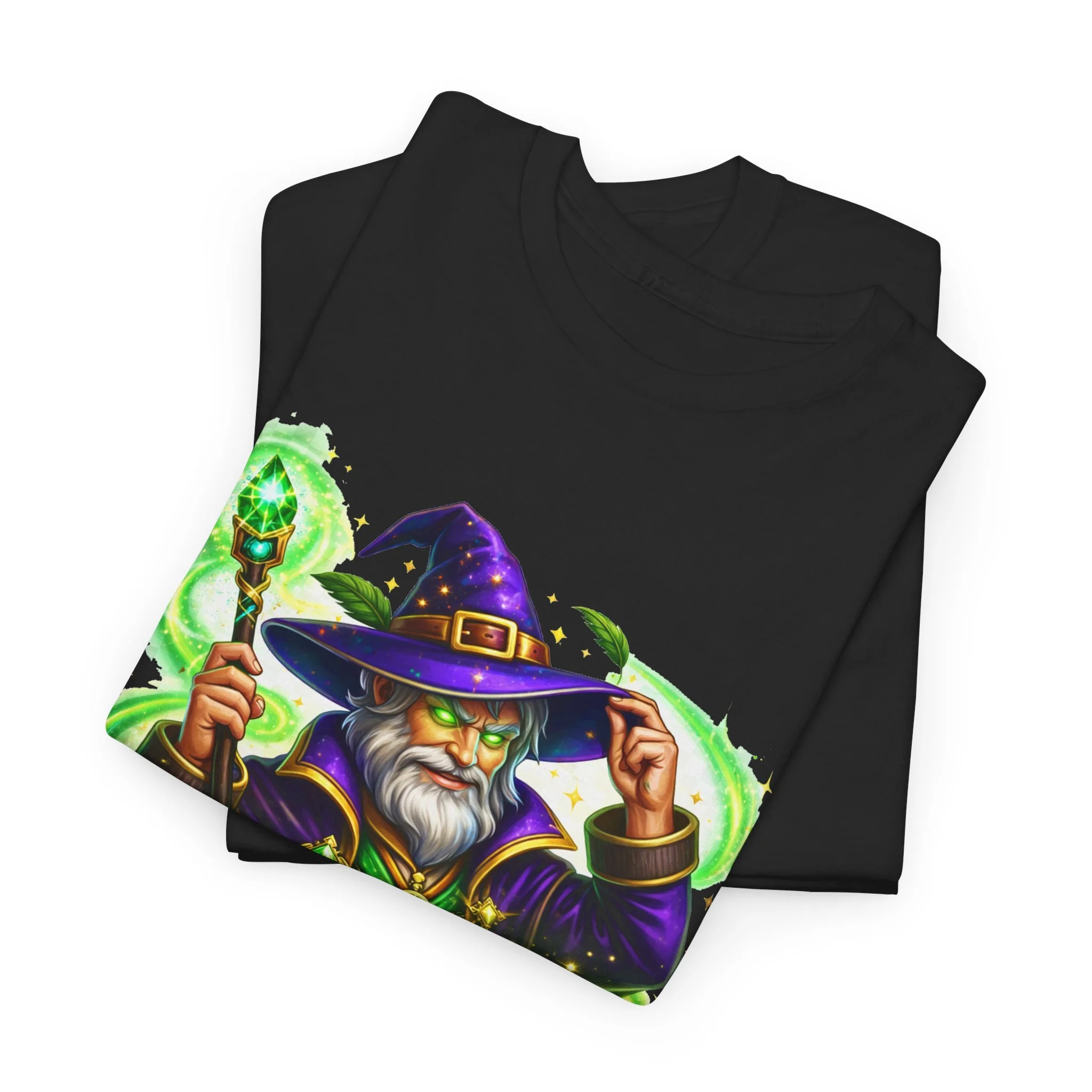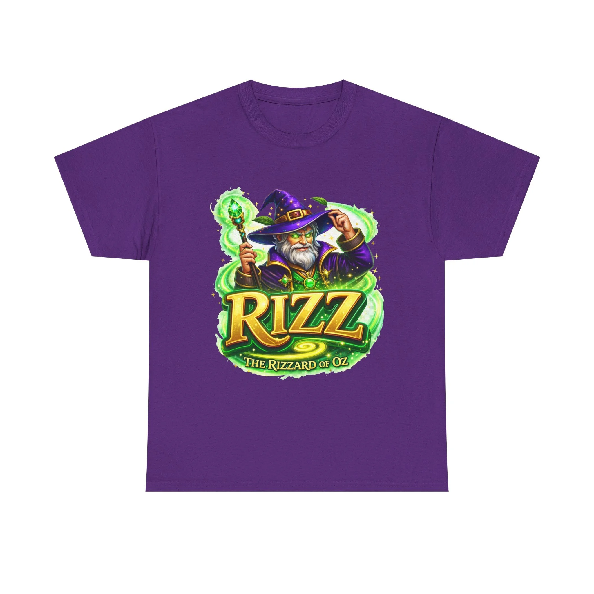 A soft, classic cotton tee printed with a bold, playful wizard illustration and bright, arcade-style lettering. The image centers on a robed wizard casting neon-green magic above the name “RIZZ,” surrounded by energetic swirls and a rich color palette that pops on the clean white fabric. Wearers will feel whimsical and nostalgic—this shirt reads like a badge for folks who love game-inspired art and tongue-in-cheek fantasy. The relaxed crew-neck cut and tear-away label keep it comfortable for long wear, while dual printing methods preserve crisp detail through washes. It’s a casual layer that brings personality to game nights, conventions, or everyday streetwear for fans of retro-fantasy visuals.