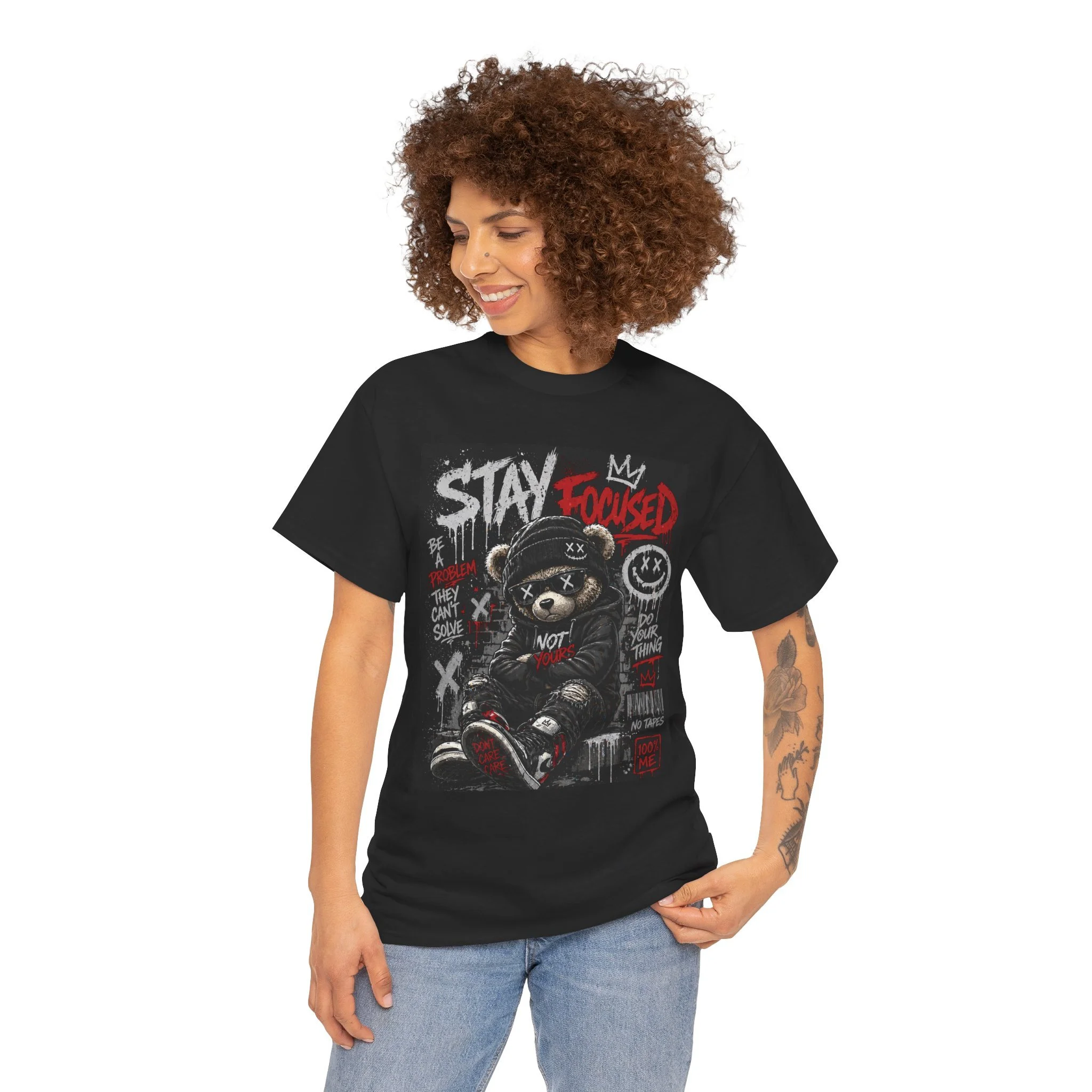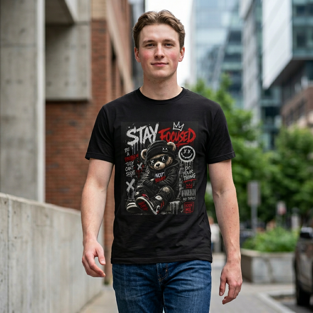 This black cotton tee brings gritty street-style energy to everyday wear. The front features a bold, graffiti-inspired composition: a tough, urban teddy bear wearing a hoodie and sneakers, surrounded by hand-drawn marks, crown motifs, and the striking phrase “STAY FOCUSED” in red and white. The design reads like a late-night mural—rough edges, layered textures, and attitude—so it pairs naturally with denim, skate shoes, and a worn-in cap. It’s a shirt for someone who values raw creativity and quiet determination; the look works for night skate sessions, city walks, or layering under a jacket for a music night. Comfortable, breathable, and built to last, this tee keeps the focus on your personal style while the artwork does the talking.